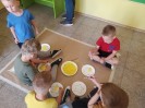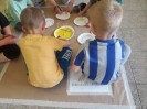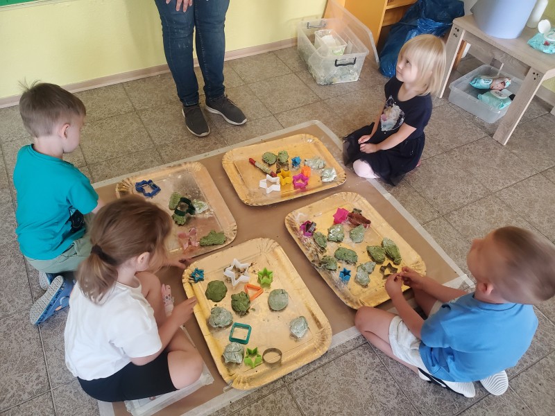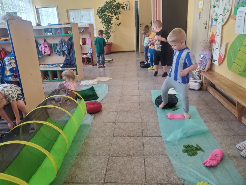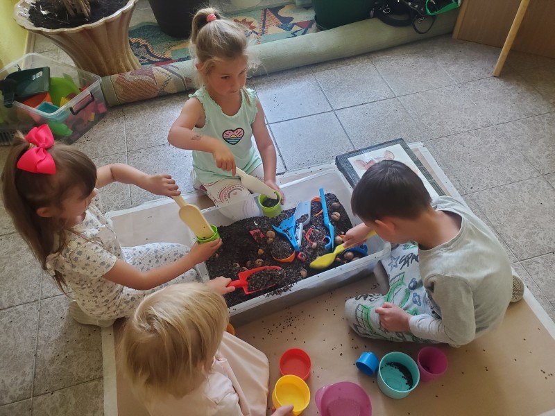 Rozpoczęliśmy od ćwiczeń paluszków, a następnie dzieci z entuzjazmem odkrywały 5 stanowisk sensorycznych, wśród których znalazły się m.in.: malowanie farbami, lepienie z ciastoliny, tor sensoryczny, mieszanka nasion i orzechów, oraz popity, które wzbudziły ogromną ciekawość!