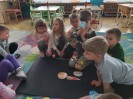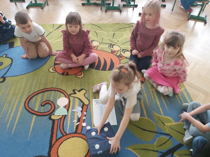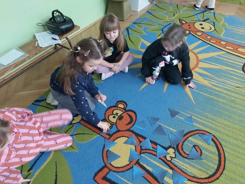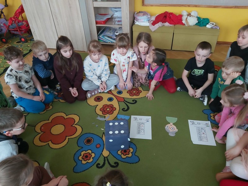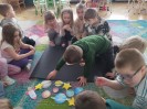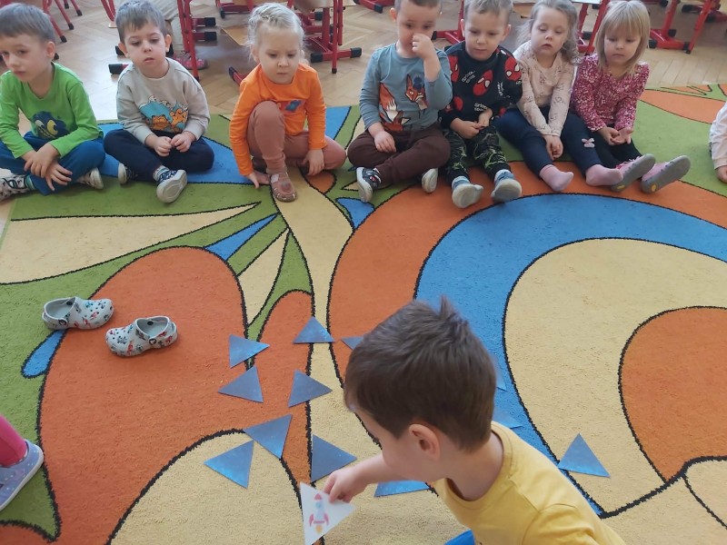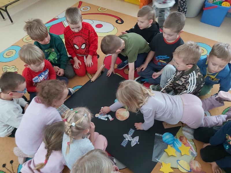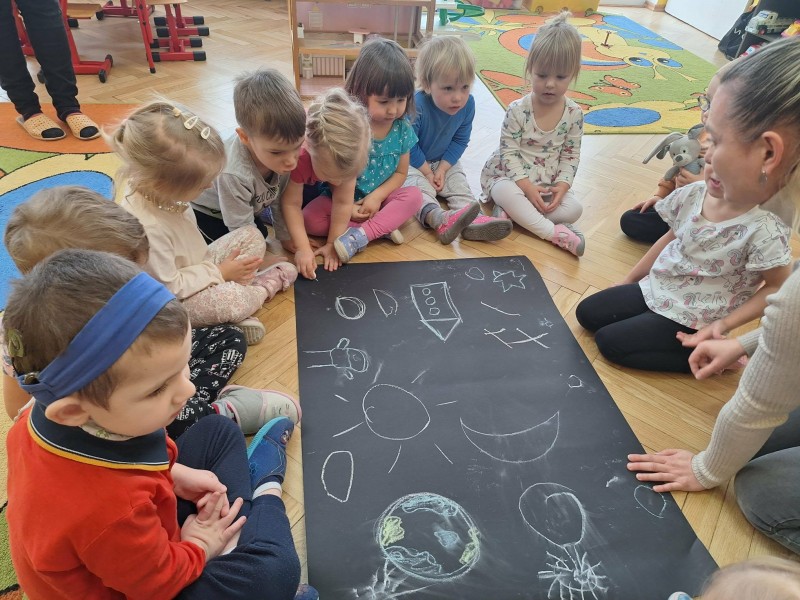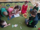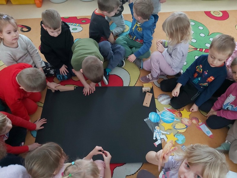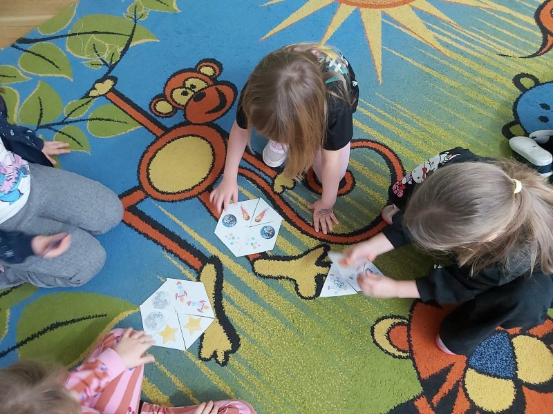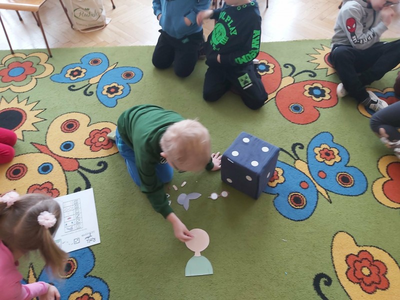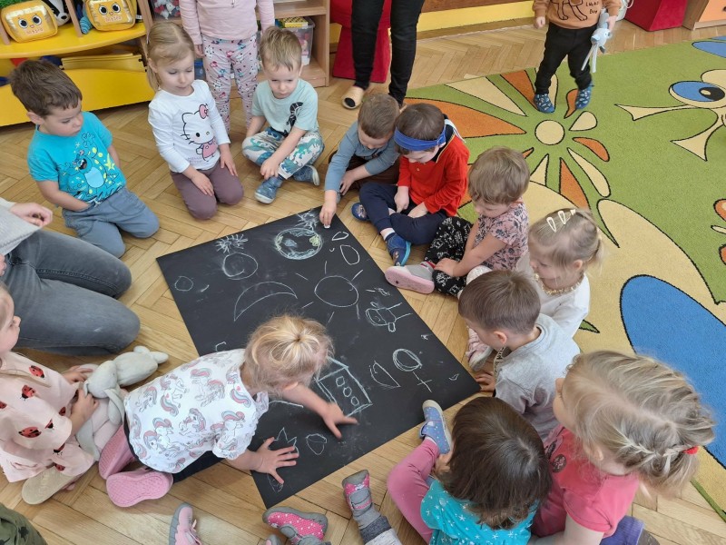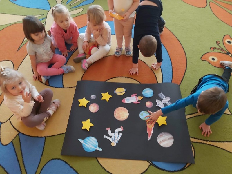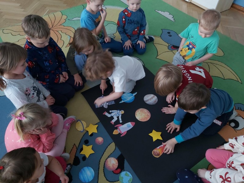 W styczniu dzieci poznawały słownictwo związane z kosmosem (star, earth, solar system, cosmonaut, rocket, comet). Projektowaliśmy przestrzeń kosmiczną. Przypominaliśmy również słownictwo związane z rodziną. Posługując się kodem tworzyliśmy postać Babci i Dziadka, gdzie ćwiczyliśmy przeliczanie po angielsku oraz części ciała (hair, eyes, ears, moustache, mouth). Bawiliśmy się w zabawy ruchowe o tematyce zimowej.