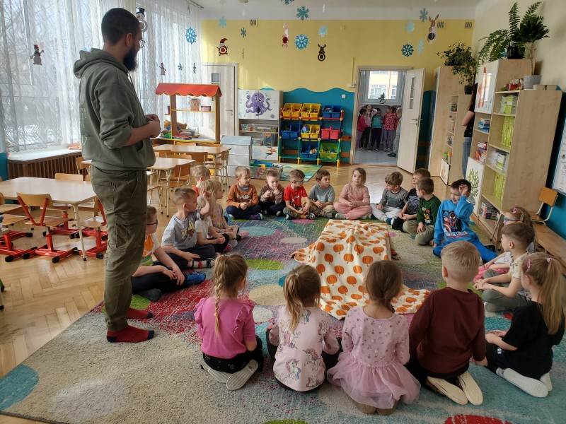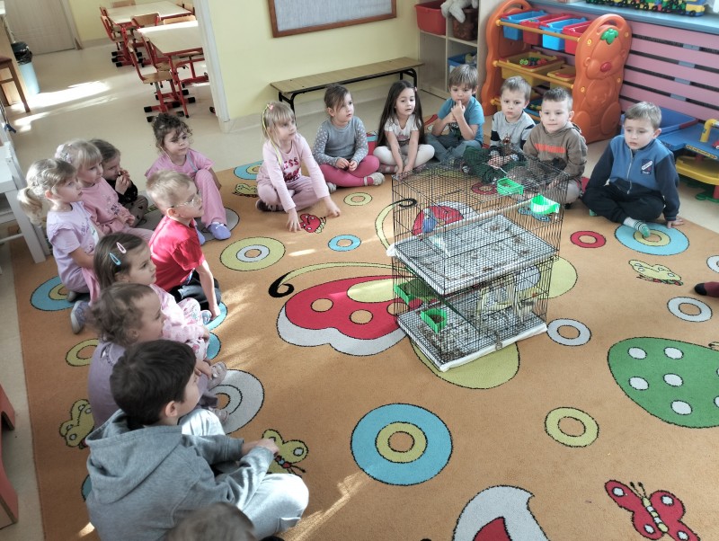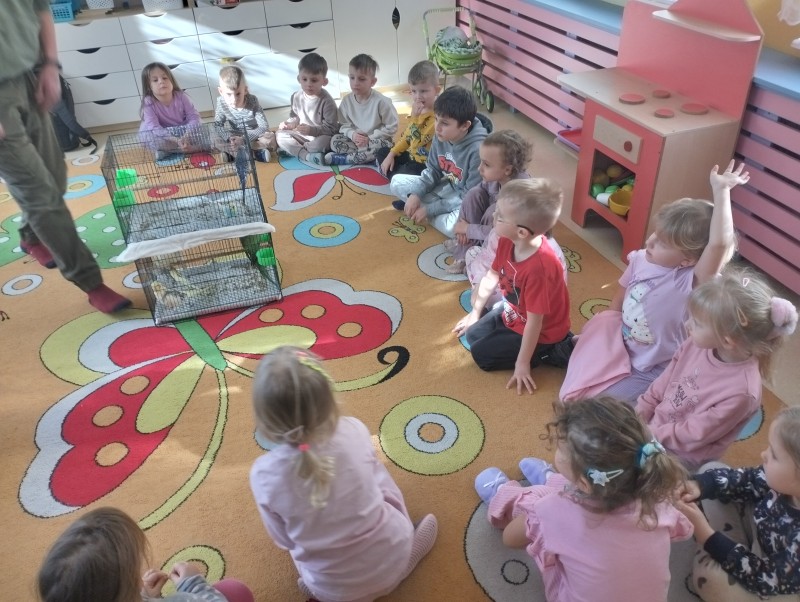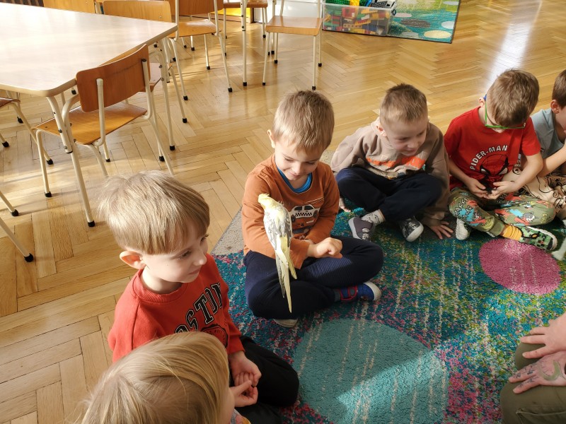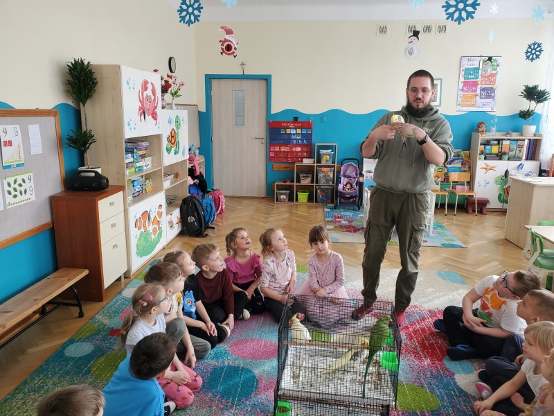 Właściciel ptaków w ciekawy i przystępny sposób opowiadał o różnych gatunkach papug, ich zwyczajach oraz o tym, jak należy dbać o te wyjątkowe zwierzęta. Przedszkolaki z uwagą słuchały opowieści, a następnie chętnie zadawały pytania, wykazując się dużą ciekawością świata.