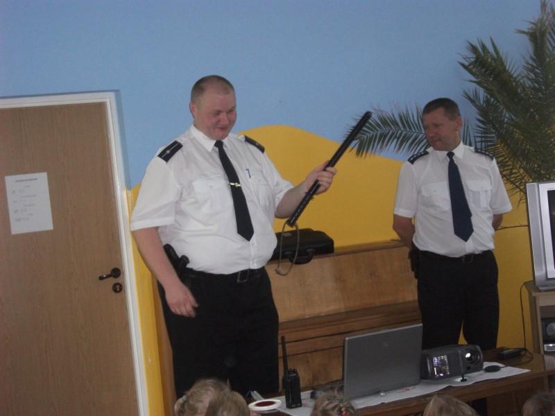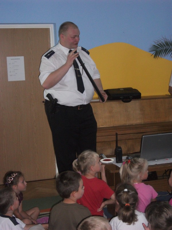 Co zrobić, gdy ktoś się zgubi, po co w samochodach foteliki, dlaczego dziecko powinno znać swój adres, jak zachowywać się przy przechodzeniu przez jezdnię, co to jest mandat, do czego służą kajdanki– to tylko niektóre sprawy, które interesowały dzieci podczas wizyty policjanta w naszym przedszkolu. W czasie spotkania dzieci poznały podstawowe zasady bezpieczeństwa na drodze i w czasie zabawy na podwórku. Podzieliły się też chętnie z policjantami informacją o wszelkich wykroczeniach, jakie popełniają rodzice w czasie jazdy samochodem – nadmierna prędkość czy jazda bez pasów nie umyka bowiem ich uwadze. Same obiecały przestrzegać zasad i dbać o własne bezpieczeństwo. Panowie policjanci opowiadali dzieciom o ograniczonym zaufaniu do obcych, uczyli, jak skutecznie obronić się przed psem, przyjmując bezpieczną pozycję „na żółwia” Ponadto zapoznały się z podręcznym sprzętem każdego policjanta. Największym zainteresowaniem maluchów cieszył się radiotelefon i kajdanki.. Tego typu spotkania pomagają zrozumieć dzieciom na czym polega ciężka i ofiarna praca policjantów, jak również uczą zasad bezpieczeństwa.