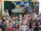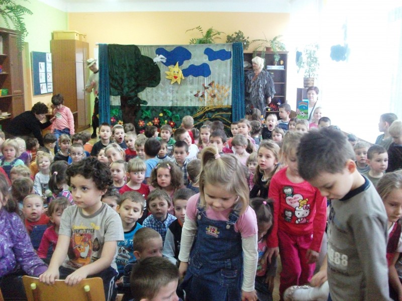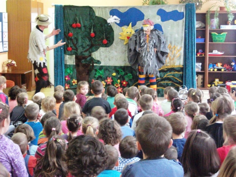 W trakcie występu, autorka pokazała dzieciom jak łatwo można samemu ułożyć wiersz, włączając ich do wspólnej zabawy w słowa i rymy. Dzieci prześcigały się w wymyślaniu słów do rymu. Tworzenie czegoś nowego, własnego, a w szczególności z autorką - sprawiało dzieciom dużo radości. Przedszkolaki były zachwycone treścią wiersza, zaprezentowanego przez naszego gościa „Krowa w centrum Krakowa". Wiele uśmiechu i humoru dostarczył im wiersz o liczbach pt. "Która ważniejsza?". Dzieci miały okazję do utrwalenia liczenia w zakresie od 1 do 10. W dalszej części spotkania poetka przedstawiła dzieciom książeczkę "O czterech porach roku". Były w niej wiersze o jesieni, bałwanie w okularach, o tym, jak zima tańczyła z wiosną i o kolorowych wakacjach. Zaletą tej książeczki były rysunki do kolorowania. Na koniec aktorzy przedstawili zabawną historię pewnego stracha na wróble i niesfornego wróbla. W rolę wróbla wcieliła się autorka wierszy dla dzieci – Bogusława Hodyl.