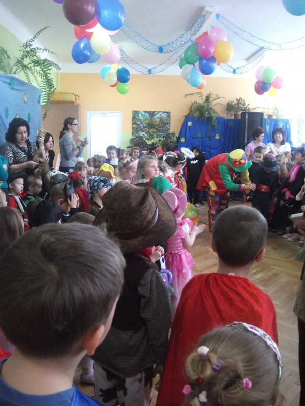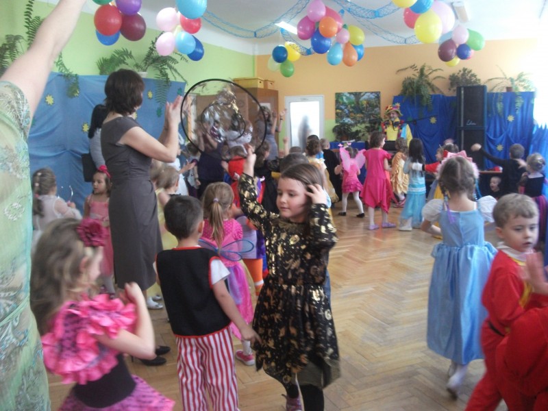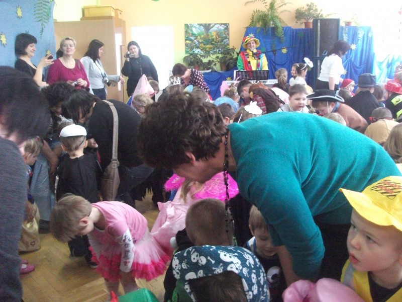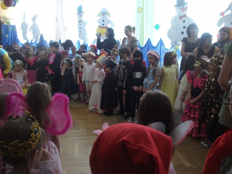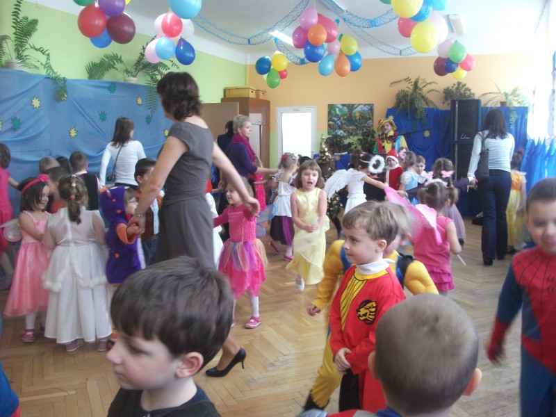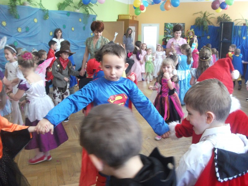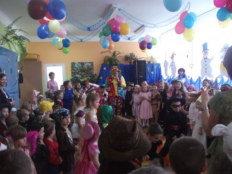 26.I. 2012 roku w godzinach 9.30 – 12.30, nasze przedszkole zamieniło się w magiczny, kolorowy świat. Gdy wybiła upragniona godzina cała sala wypełnia się dziećmi i nie tylko dziećmi z naszego przedszkola, ale także gośćmi zewnętrz: rodzice, dziadkowie. Dzieci przebrane w różnorodne, kolorowe stroje wspaniale bawiły się w rytm muzyki i śpiewu pana Wodzireja. Dziewczynki przebrane w długie powłóczyste balowe suknie księżniczek czy też dam dworu, zaś chłopcy najczęściej wybierali strój Batmana, Spidermana, Pirata i Kowboja. Podczas trwania zabawy odbyły się różne qizy i konkursy np. na najładniejszą piosenkę i wiersz. Wspólna zabawa przysporzyła wiele radości naszym pociechom, a to było głównym celem naszego balu.