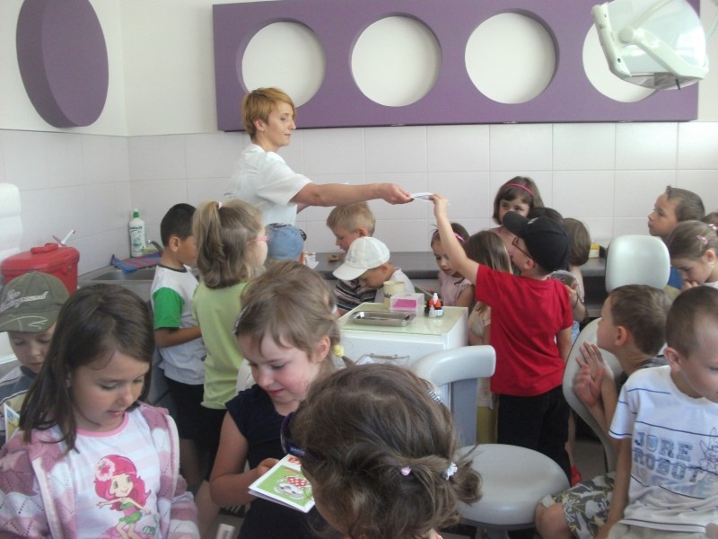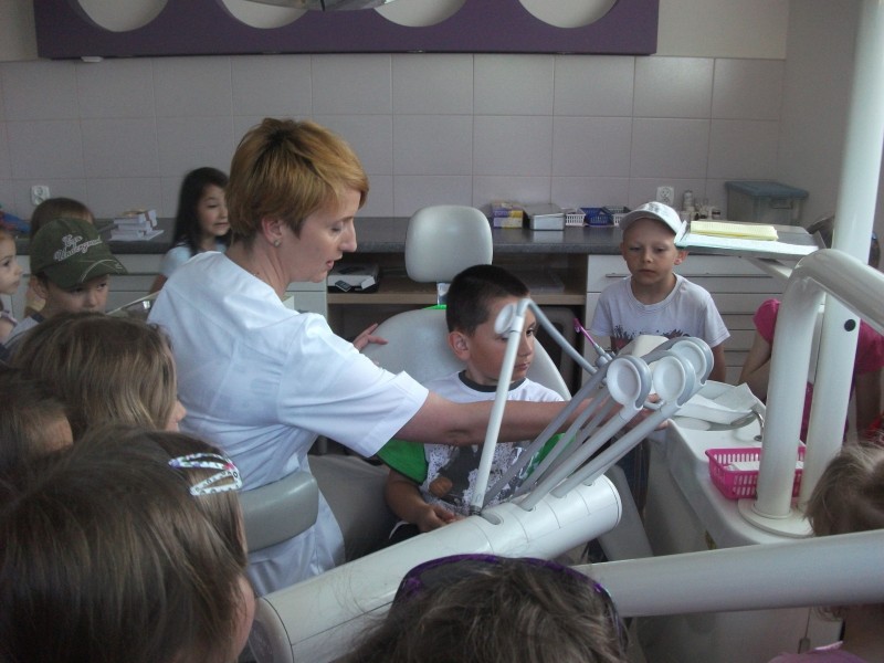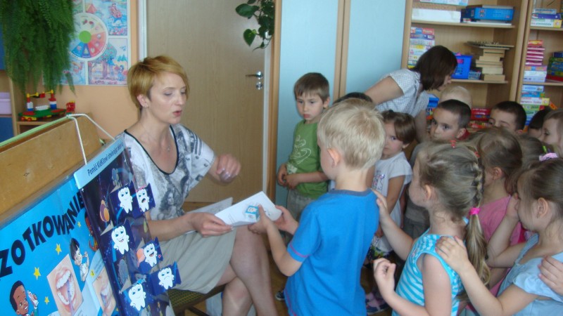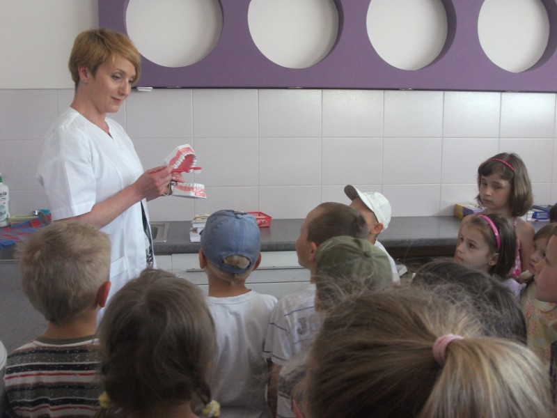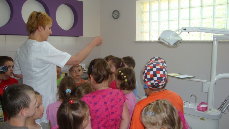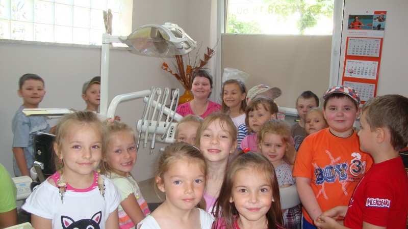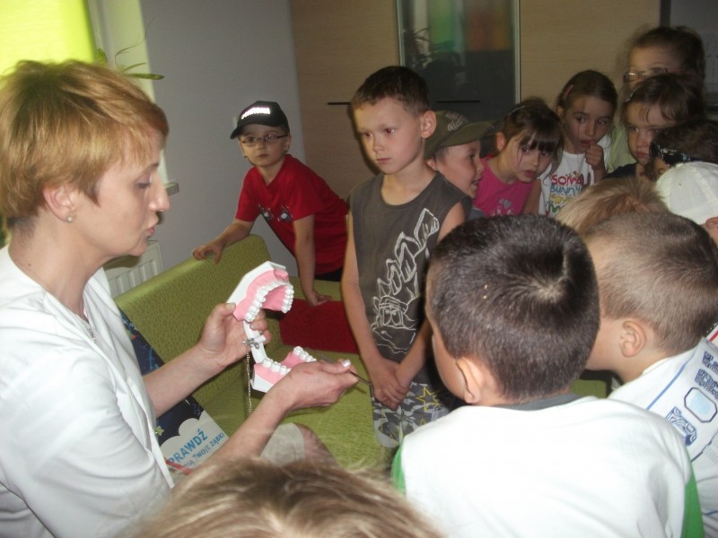 Pani doktor w ciekawy sposób opowiedziała dzieciom, co należy robić, aby mieć piękne i zdrowe zęby, pokazała dzieciom niektóre narzędzia dentystyczne oraz model szczęki na którym dokładnie zademonstrowała prawidłowy sposób mycia zębów. Dzieci były bardzo zaciekawione spotkaniem, zadawały mnóstwo pytań. W nagrodę otrzymały od pani doktor prezenty. Dzieci z grup starszych pani Ewa zaprosiła do gabinetu stomatologicznego. Wszystkie dzieci obiecały dbać o zęby i systematycznie odwiedzać gabinet stomatologiczny.