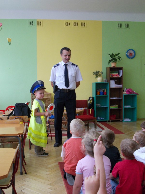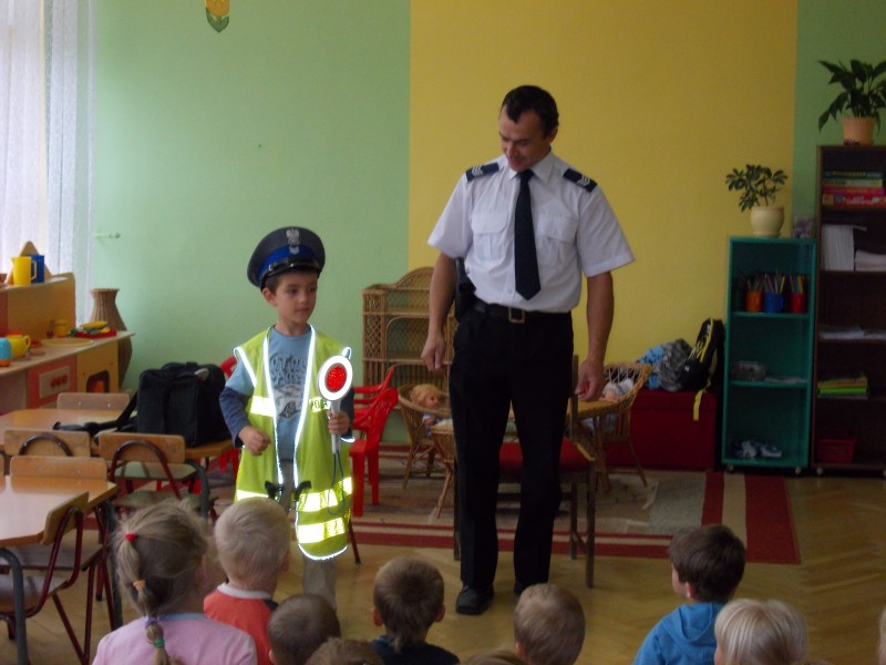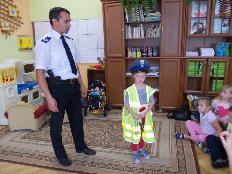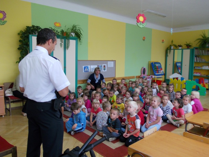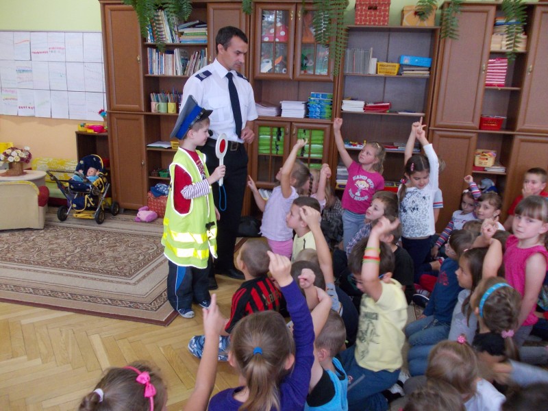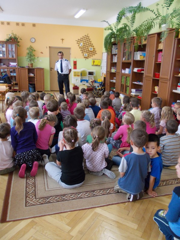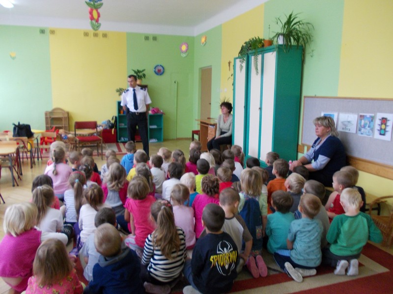 20 września w naszym przedszkolu złożył wizytę sierż. szt. Hubert Bździuch. Przedstawiciel Komendy Policji w bardzo przystępny sposób zapoznał dzieci między innymi z zasadami bezpiecznego poruszania się po drodze, uświadomił potrzebę jeżdżenia w fotelikach z zapiętymi pasami, noszenia przedmiotów odblaskowych w nocy, przestrzegł przed niebezpiecznymi skutkami wynikającymi z eksploatacji maszyn rolniczych przez nieuprawnione osoby , uczulił słuchaczy na zachowanie ostrożności w stosunku do obcej osoby dorosłej.