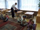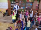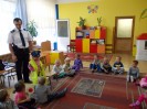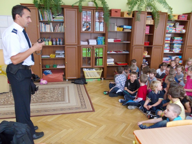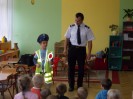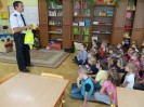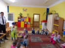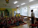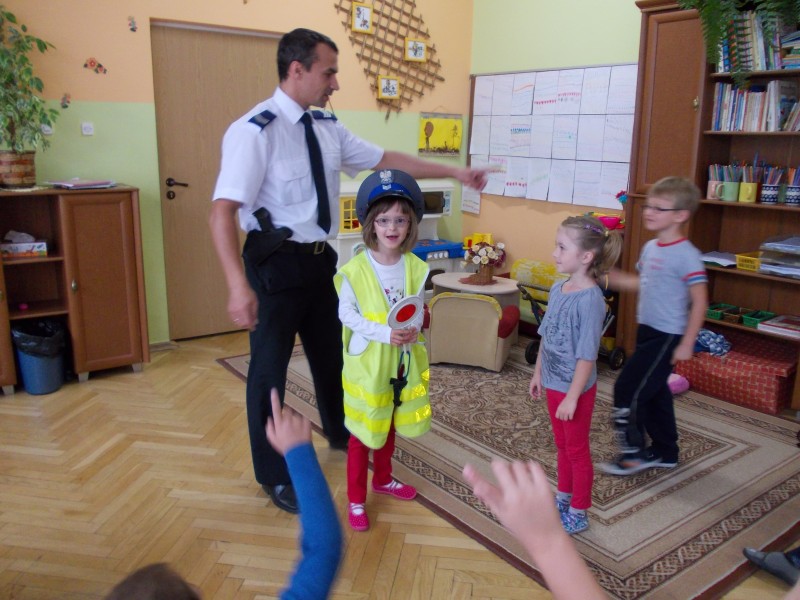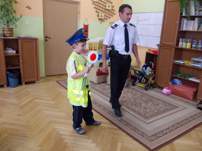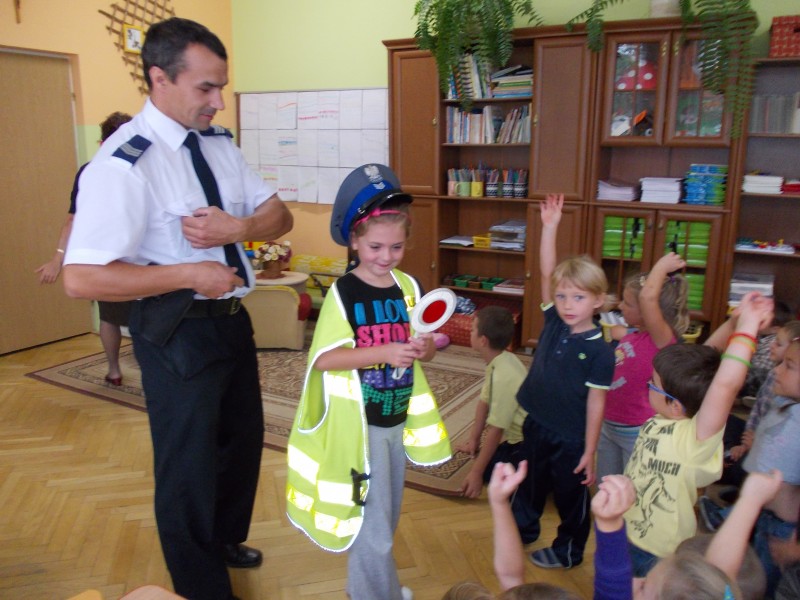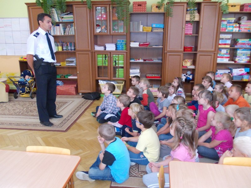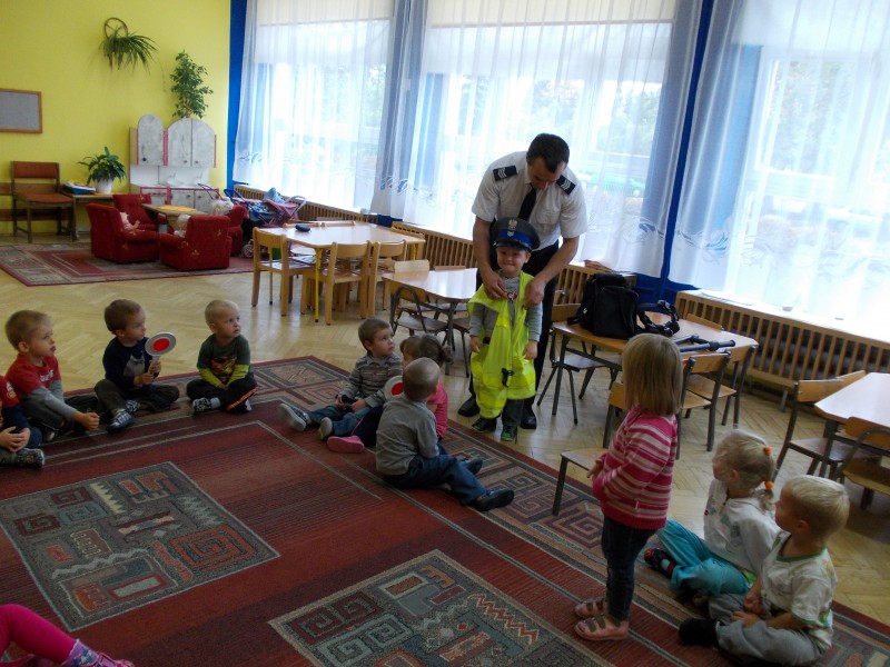 20 września w naszym przedszkolu złożył wizytę sierż. szt. Hubert Bździuch. Przedstawiciel Komendy Policji w bardzo przystępny sposób zapoznał dzieci między innymi z zasadami bezpiecznego poruszania się po drodze, uświadomił potrzebę jeżdżenia w fotelikach z zapiętymi pasami, noszenia przedmiotów odblaskowych w nocy, przestrzegł przed niebezpiecznymi skutkami wynikającymi z eksploatacji maszyn rolniczych przez nieuprawnione osoby , uczulił słuchaczy na zachowanie ostrożności w stosunku do obcej osoby dorosłej.