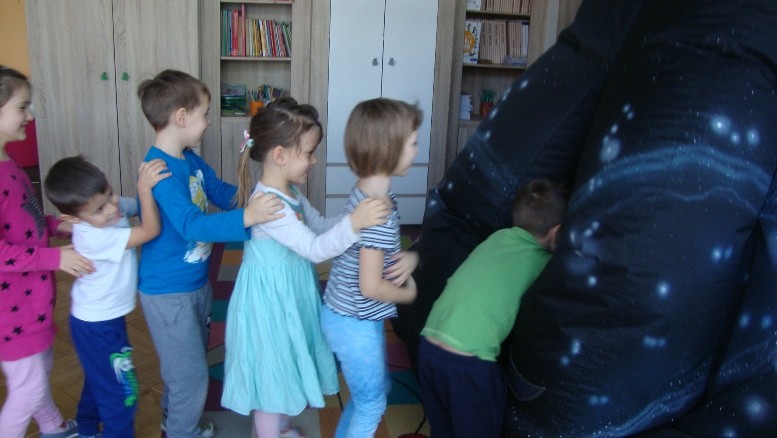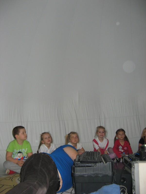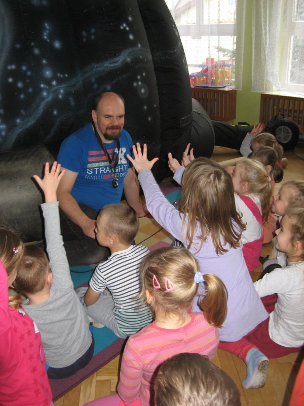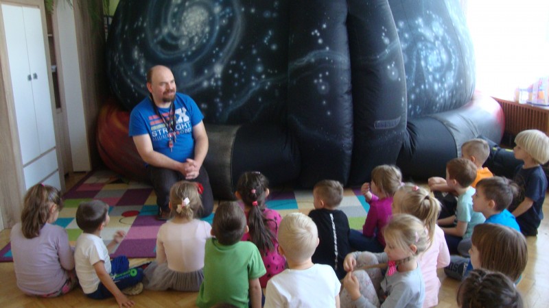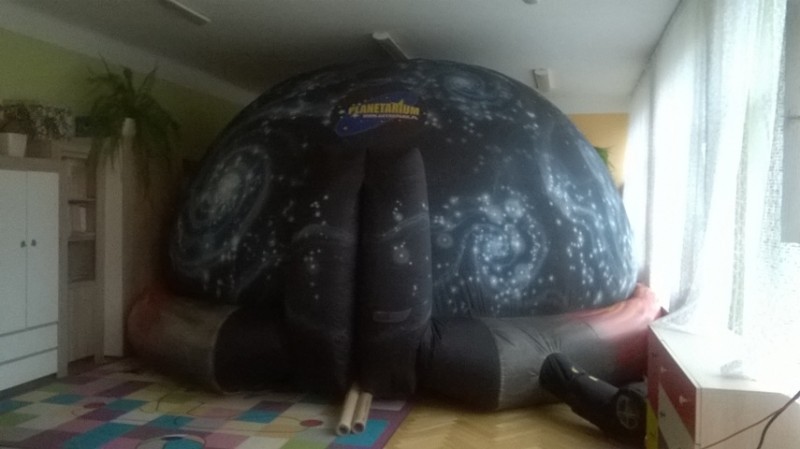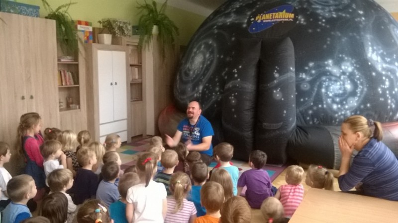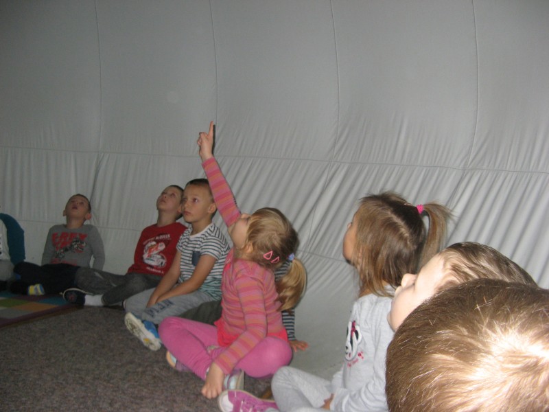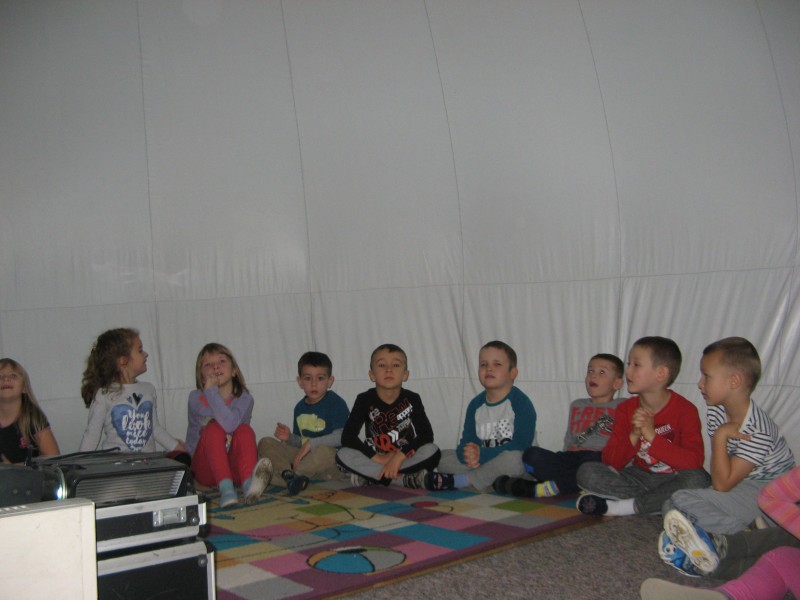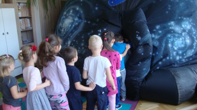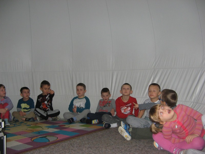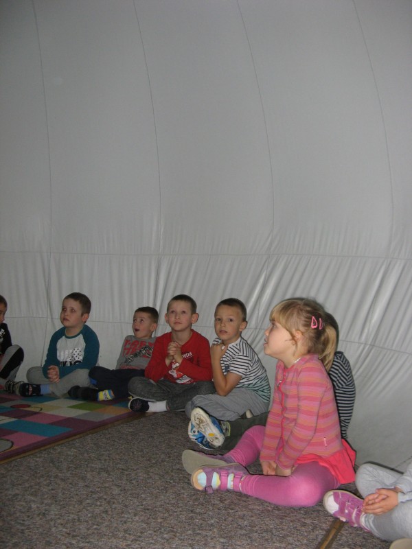 W dniu 25 listopada nasze przedszkolaki uczestniczyły w pokazie Mobilnego Planetarium" Jupiter". Mobilne planetarium to połączenie rozrywki z interesującą formą nauki. Projekcja odbywała się w specjalnej kopule o kształcie kuli, która dawała wrażenie przestrzeni kosmicznej. Dzieci zobaczyły jak powstawał wszechświat, galaktyki, układ słoneczny, zobaczyły ruch planet. W czasie pokazu lektor tłumaczył zagadnienia z zakresu przyrody, fizyki i astronomii.