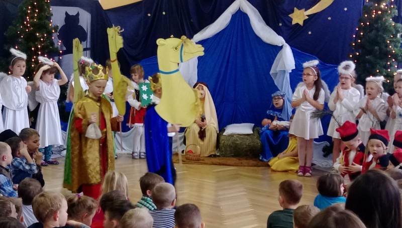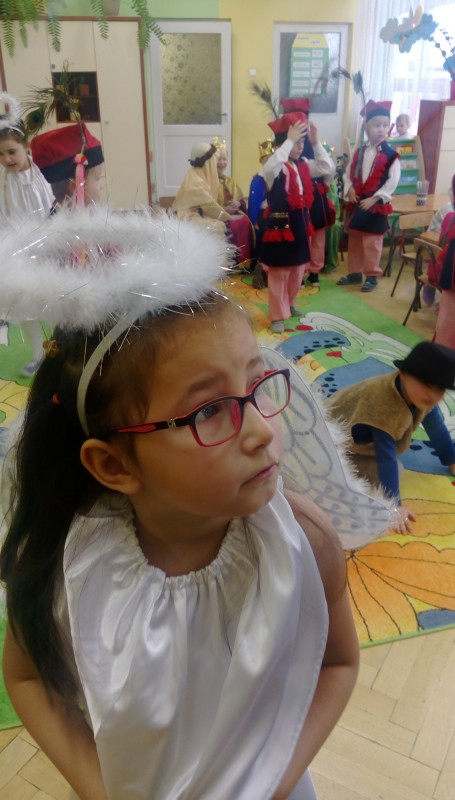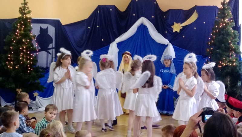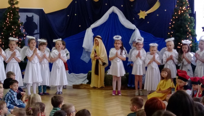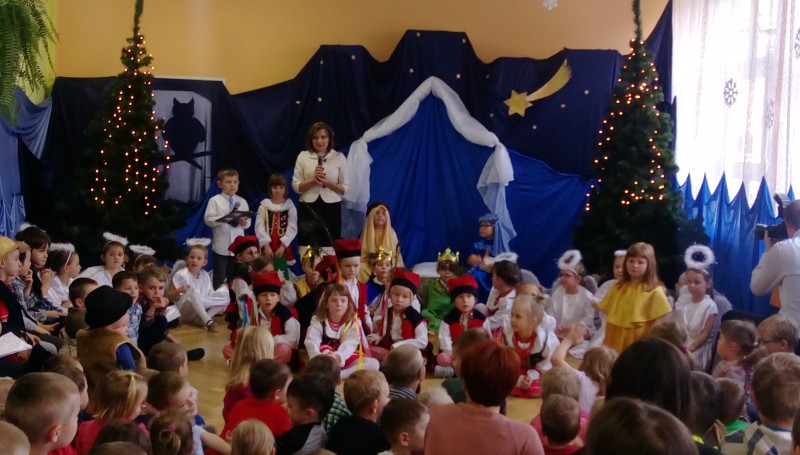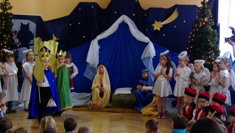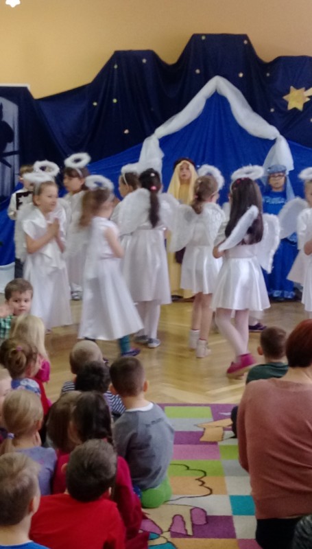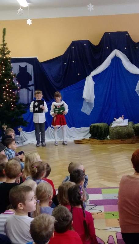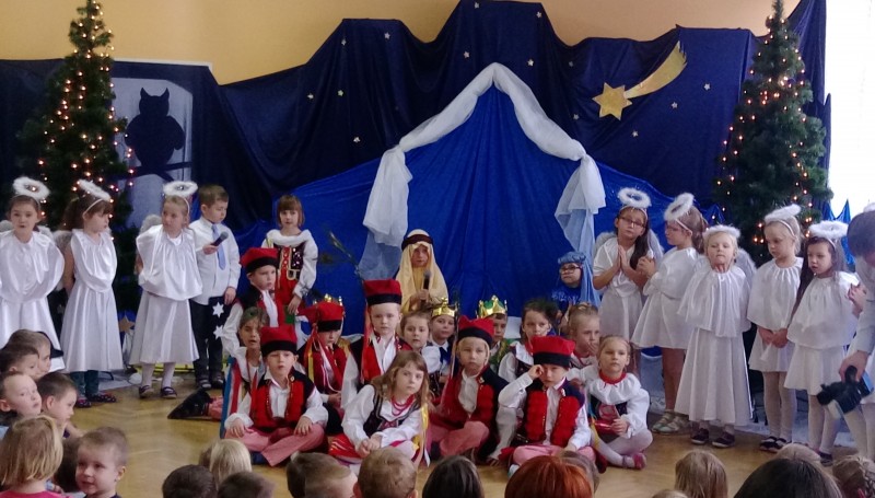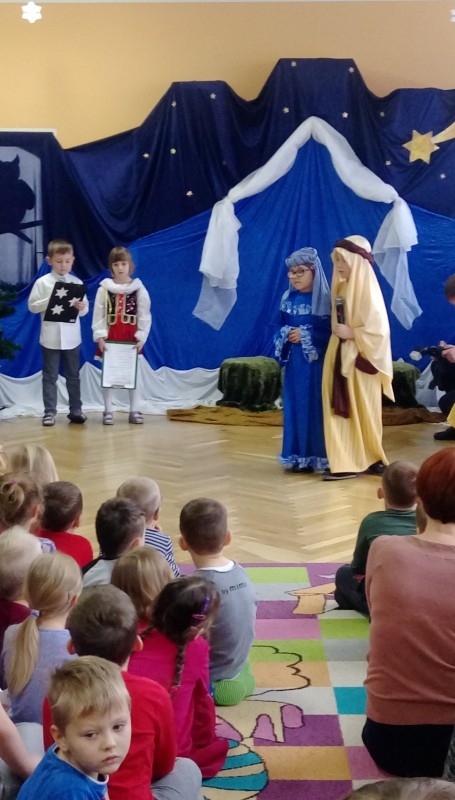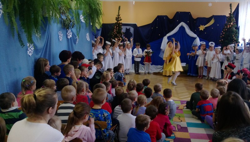 Uroczystość Jasełek od wielu lat wpisana jest do kalendarza uroczystości organizowanych w naszym przedszkolu. W tym roku również dzieci znajstarszych grup przedstawiły Jasełka dla wszystkich przedszkolaków, rodziców i zaproszonych gości. Głównym celem tej uroczystości było wprowadzenie uczestników w radosną atmosferę Świąt Bożego Narodzenia, kształcenie umiejętności wyrażania uczuć i przeżyć podczas inscenizacji Jasełek, wzmacnianie więzi emocjonalnej z rodziną, rozwijanie indywidualnych predyspozycji i uzdolnień aktorskich dzieci oraz nabywanie odwagi, śmiałości podczas występów przed publicznością. Przedstawienia były wyjątkowe, a mali aktorzy spisali się znakomicie.