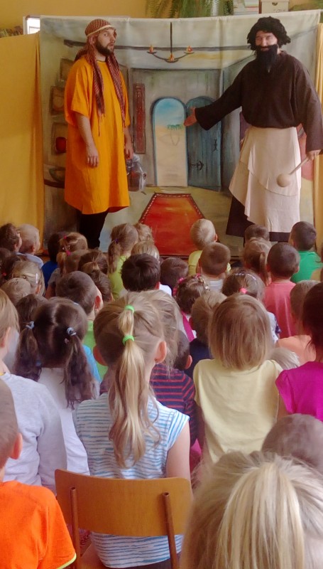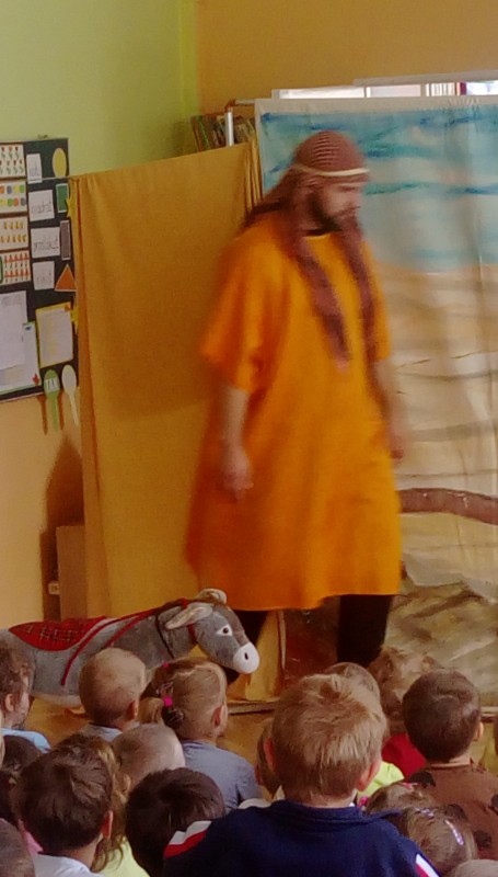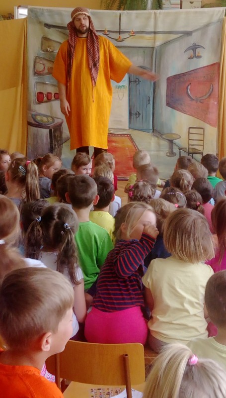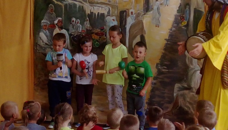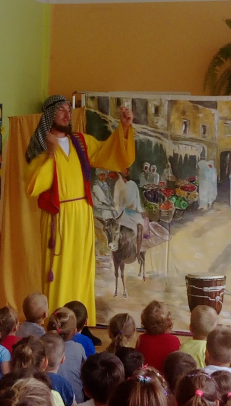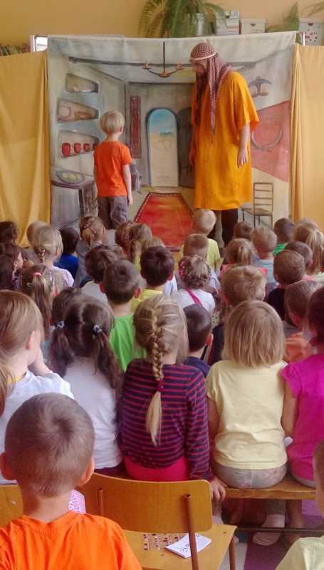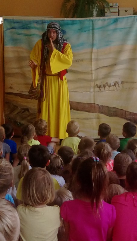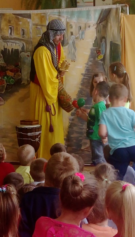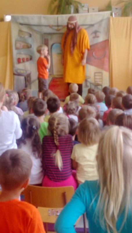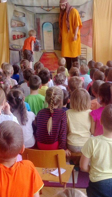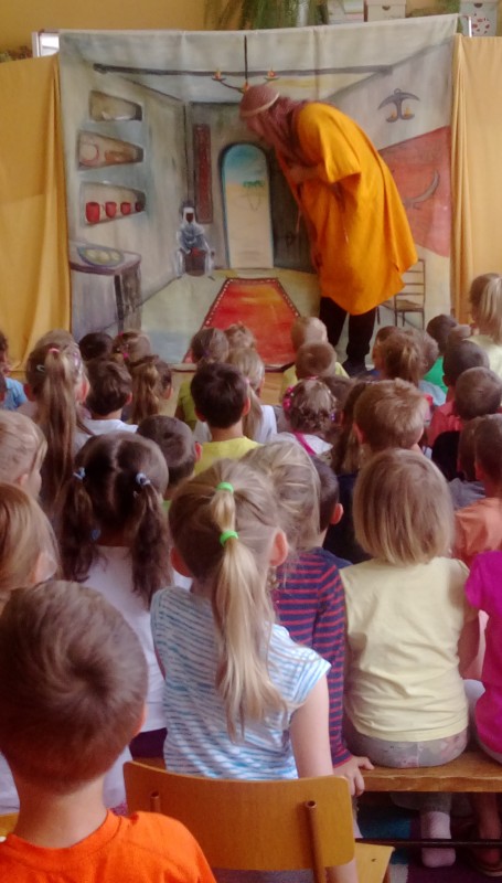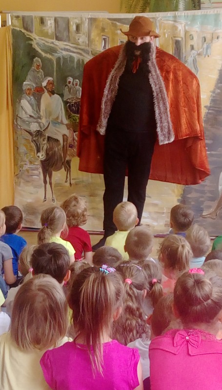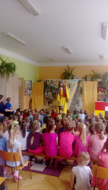 W poniedzałek 5 czerwca nasze przedszkole odwiedził teatr Eden, z przedstawieniem pt."Opowieść o dobrym człowieku". Był to spektakl, który zaprezentował interpretację biblijnej przypowieści "O dobrym Samarytaninie". Przedszkolaki poznały historię napadniętego człowieka, na którego tragedię przechodzący ludzie pozostawali obojętni, a dopiero Samarytanin zauważył cierpiącego i postanowił mu pomóc. Dzieci brały czynny udział w przedstawieniu grając na instrumentach oraz rozmawiając z bohaterami. Teatrzyk miał na celu poznanie kim jest bliźni, i że zawsze należy być dobrym człowiekiem gotowym nieść pomoc potrzebującym.