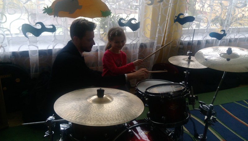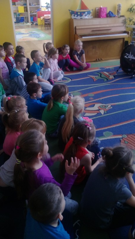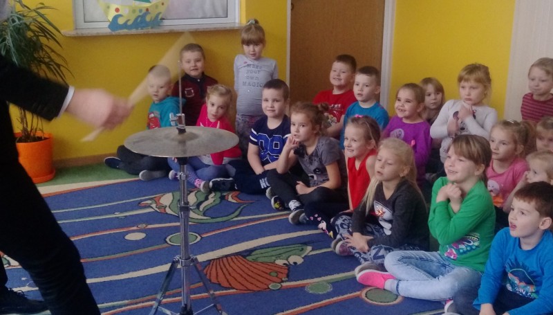 W piątek 17 listopada do naszego przedszkola zawitali profesjonalni muzycy z Rzeszowa. Dzieci miały możliwość wysłuchania gry na różnych instrumentach. Poznały jak wygląda i brzmi: werbel,tomy, hi-hat, talerze i inne. Przedszkolaki mogły również zagrać na perkusji swoją interpretację muzyki.