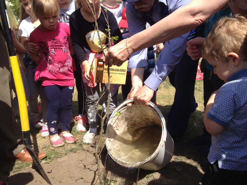 W związku z przypadającą w tym roku setną rocznicą odzyskania przez Polskę niepodległości Lubelski Urząd Wojewódzki zainicjował akcję sadzenia "Dębów Niepodległości". Do tej szlachetnej akcji przyłączyło się również nasze przedszkole. 8 maja tuż przed obiadem przedszkolaki uroczyście posadziły swoje drzewo, które nazwały "Józio". Sadzonki dębu zapewniło Nadleśnictwo Biłgoraj, a nad jego prawidłowym sadzeniem czuwał leśniczy p. Paweł Dec.