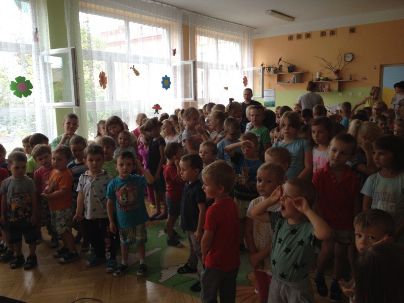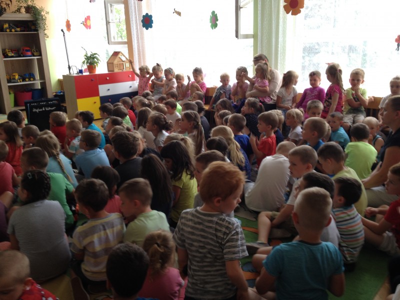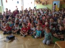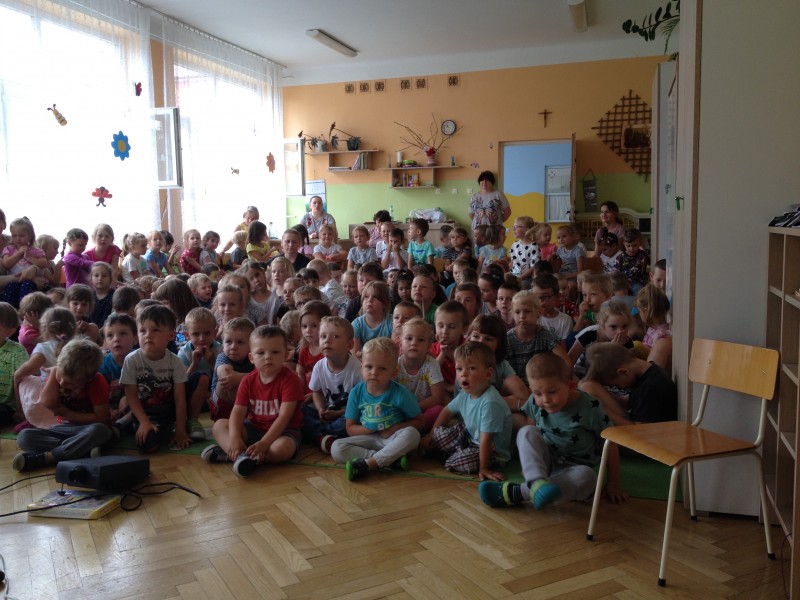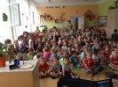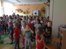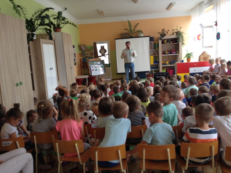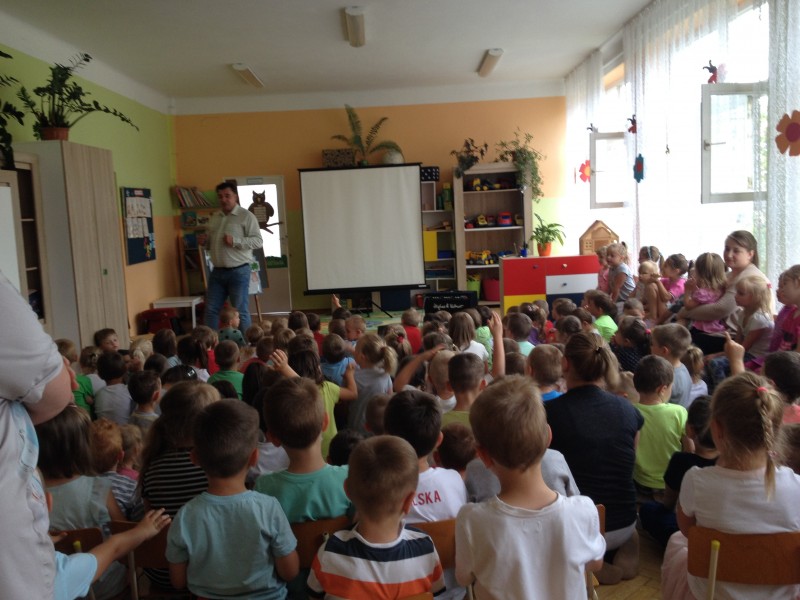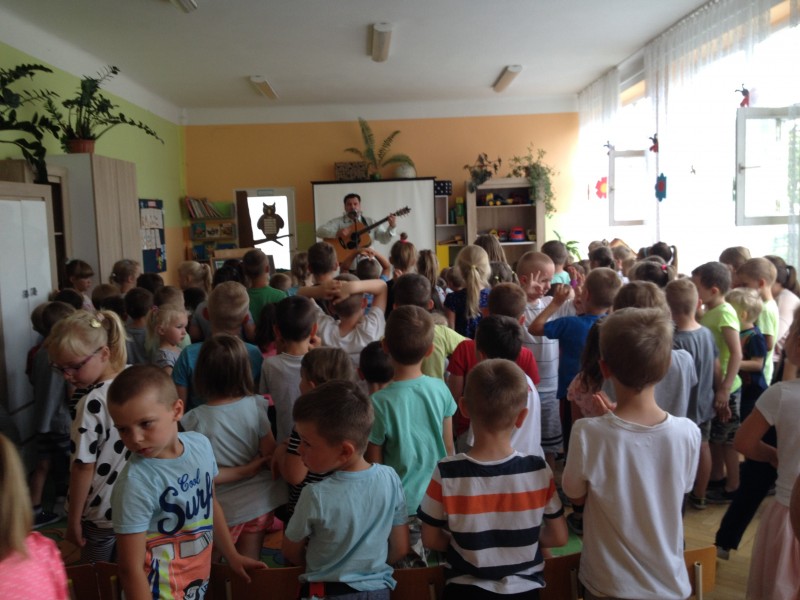 W poniedziałek 11 czerwca dzieci z całego przedszkola miały możliwość obejrzenia spektaklu edukacyjno - rozrywkowego "Z ekologią naTy". Po krótkim obejrzeniu filmiku o segregowaniu śmieci i różnych odpadów przedszkolaki wspólnie z panem Mariuszem włączyły się do zabaw i wspólnego śpiewu. Poprzez wesołą muzykę utrwalały sobie nawyki dbania o środowisko.