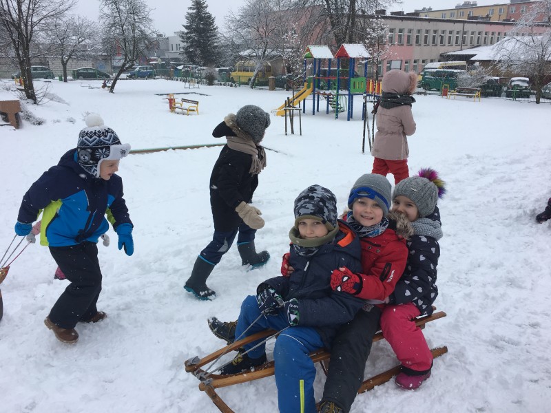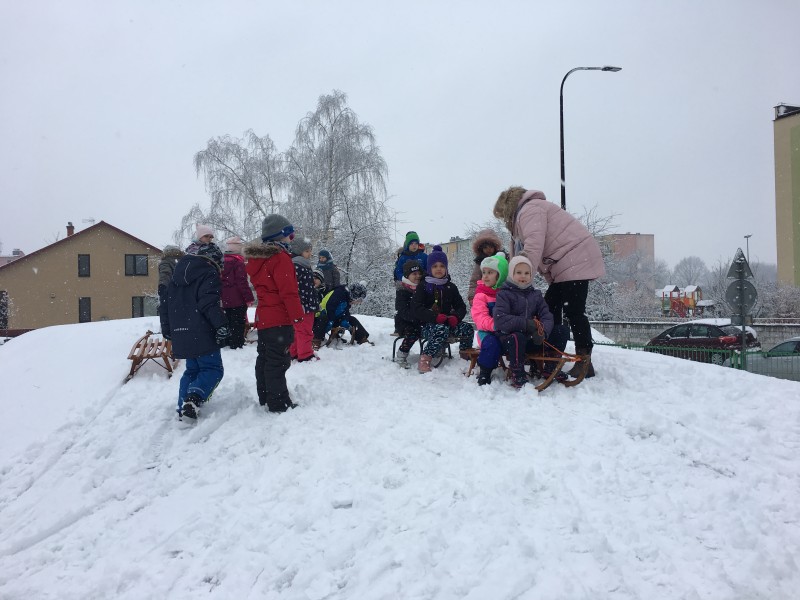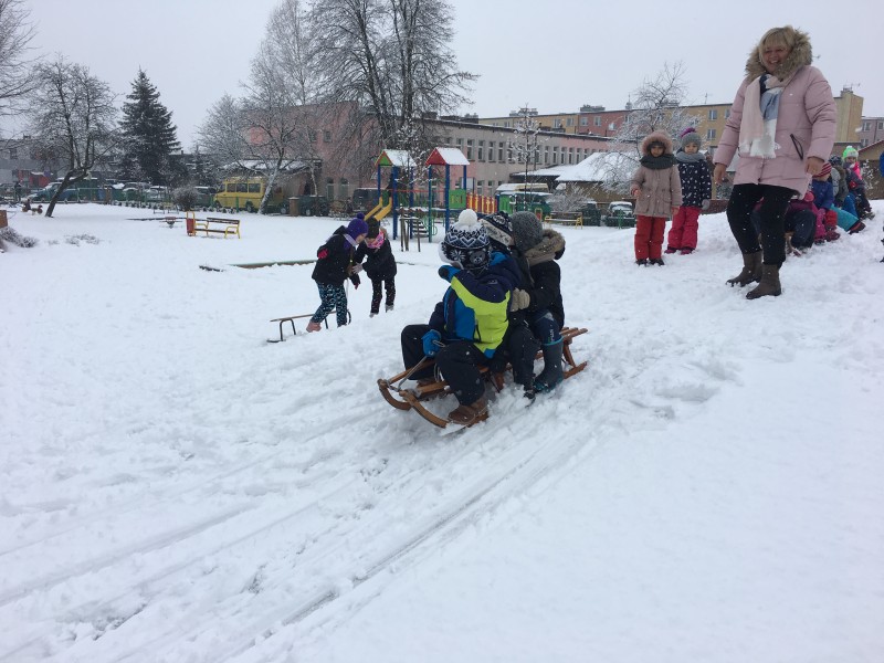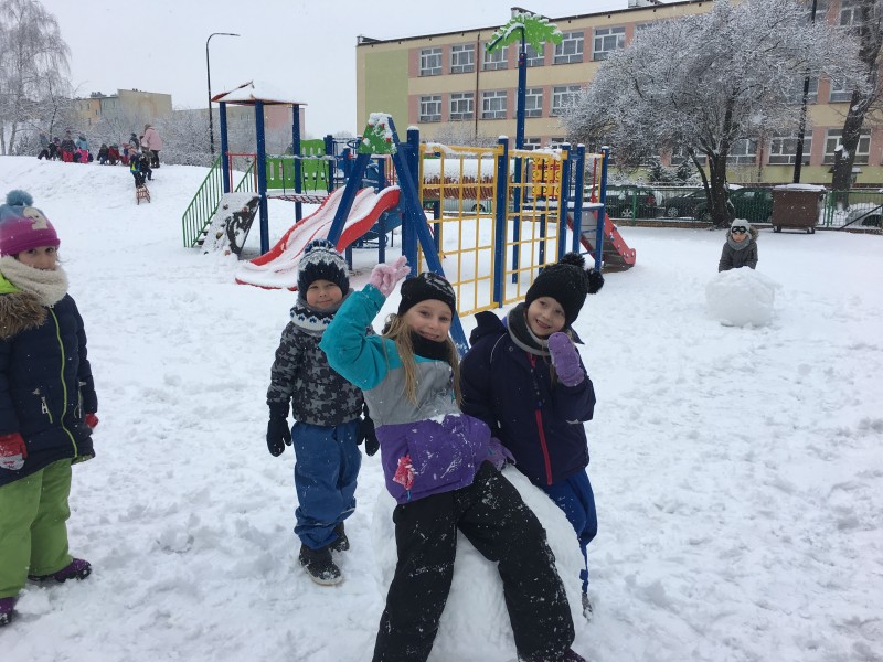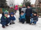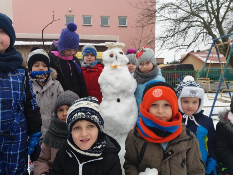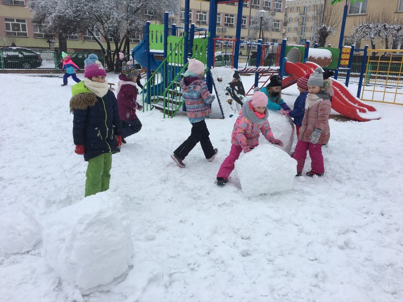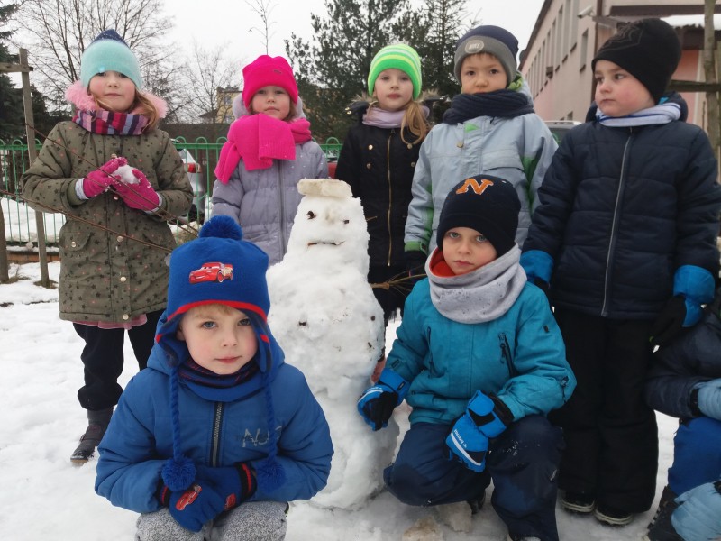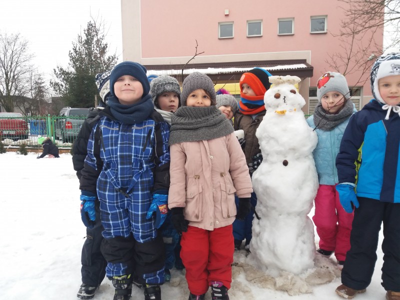 Dzieci kochają zabawy na świeżym powietrzu, szczególne wtedy, gdy wokoło pełno białego puchu. Tegoroczna zima płata nam figle, pogoda zmienia się co kilka dni. Dlatego korzystając z jej uroku postanowiliśmy pobawić się na śniegu w naszym przedszkolnym ogrodzie. Dzieci oddały się zimowemu szaleństwu, zjeżdżając na sankach, rzucając śnieżkami do siebie, a także "atakując" kulami śniegowymi swoje panie (oczywiście zachowując zasady bezpieczeństwa). Po "górkowych" wyczynach przyszedł czas na ulepienie bałwana. Po powrocie do budynku przedszkola - niektóre rękawiczki i spodnie były mokre… ale serca szczęśliwe.