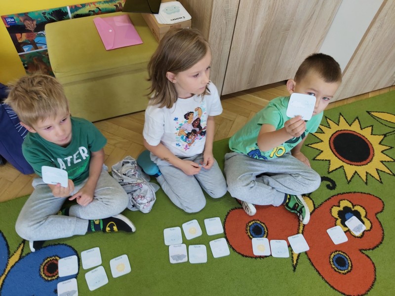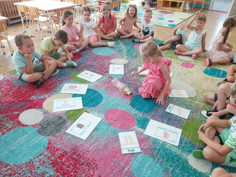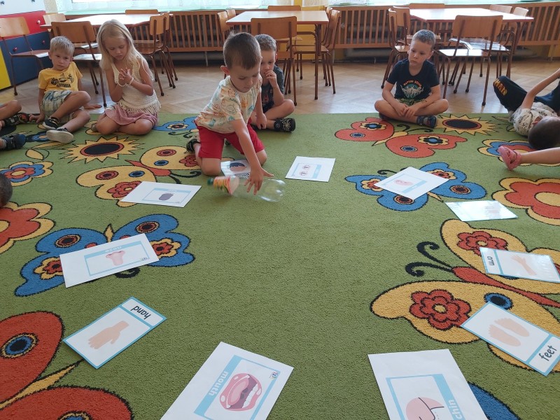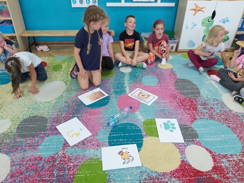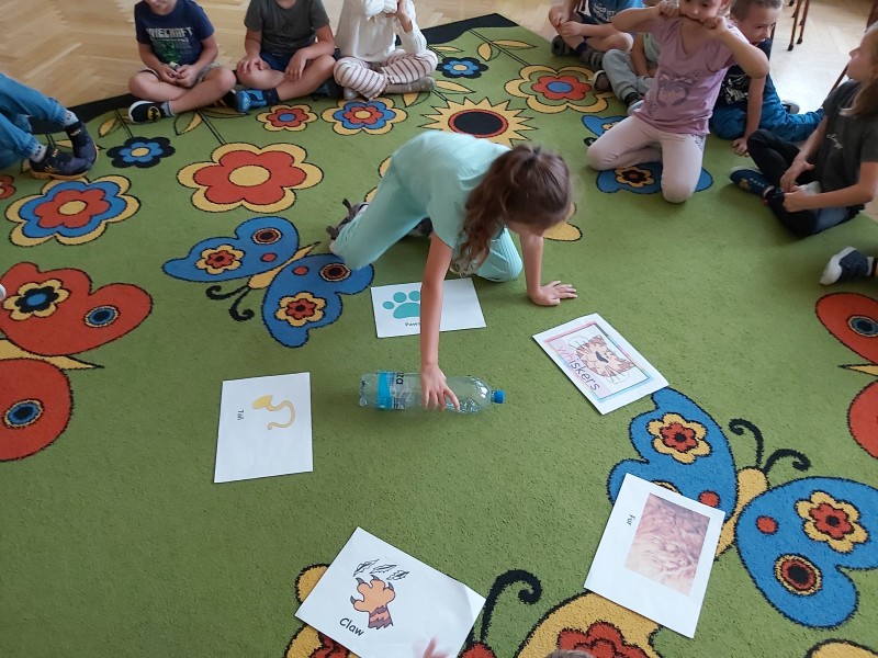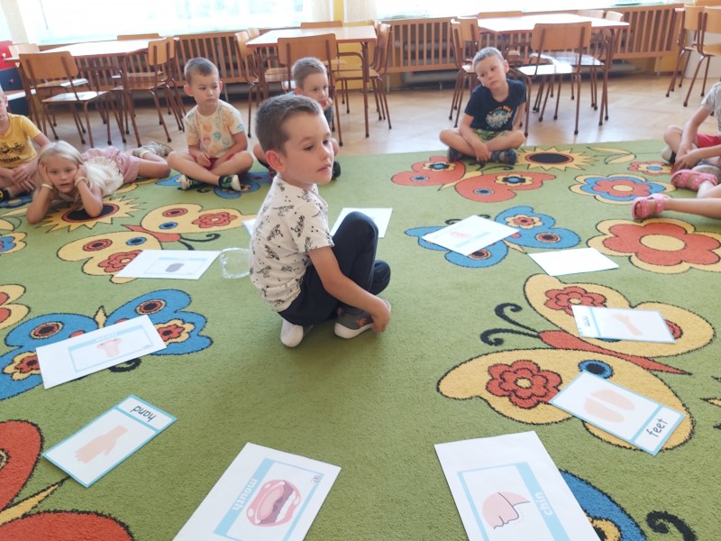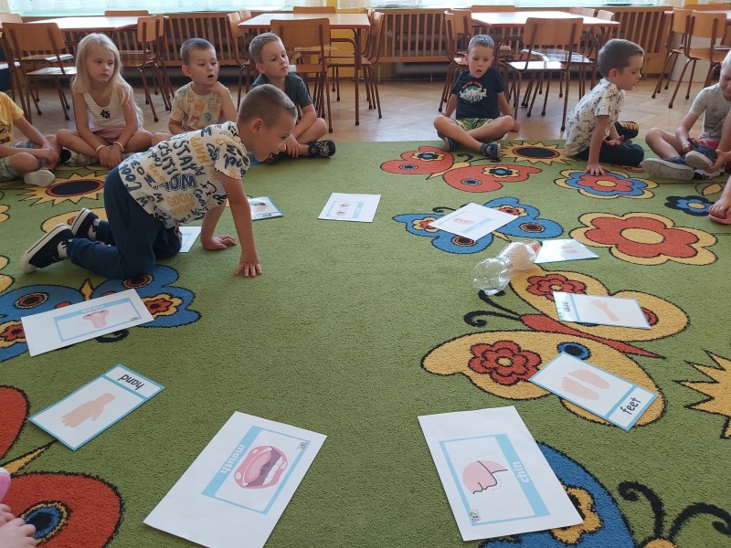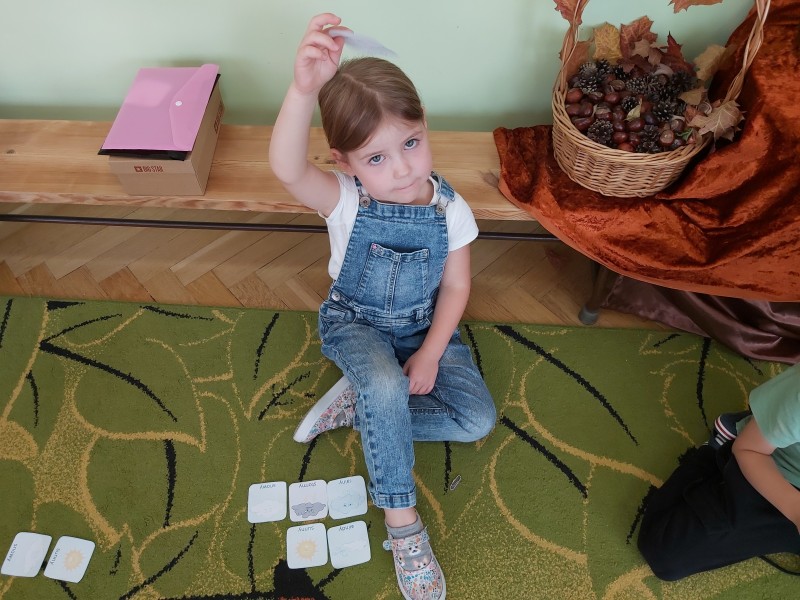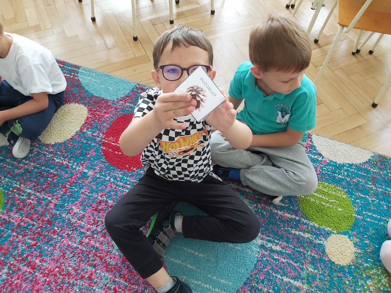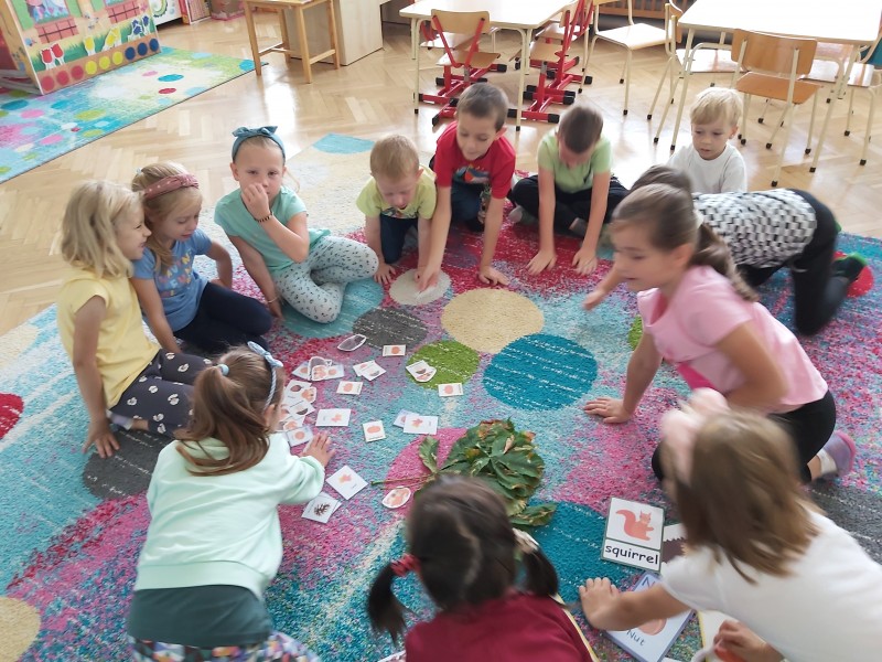 Do tej pory z języka angielskiego zdążyliśmy poznać części ciała nasze oraz zwierząt bawiąc się przy tym znakomicie. Październik rozpoczęliśmy od zapoznania się ze słownictwem, które kojarzy nam się z jesienią (acorn, hedgehog, squirrel, nut, chestnut) oraz zaczęliśmy rozmawiać o pogodzie (windy, sunny, stormy, reiny, snowy).