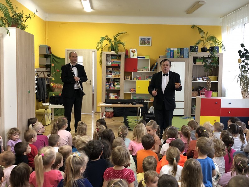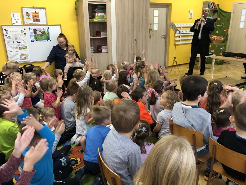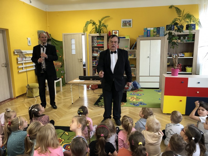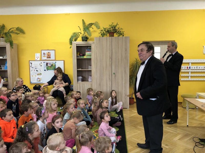15 listopada w naszym przedszkolu odbyło się niezwykłe spotkanie z muzyką. Niezwykłe, za sprawą niecodziennych gości, profesjonalnych muzyków z Filharmonii z Lublina. Muzycy w koncercie pt. „Jesień” zaprezentowali wygląd, budowę i brzmienie klarnetu. Zagrali różne melodie z muzyki klasycznej oraz utwory ze znanych bajek np. ,,Koziołek Matołek” czy ,,Miś Uszatek”. Włączali dzieci do wspólnej zabawy poprzez wystukiwanie rytmu, klaskanie, machanie. Stroje artystów, ich profesjonalna gra na instrumentach oraz odpowiedni sposób przekazywania muzycznej wiedzy sprawiły, że koncert przyniósł dzieciom wiele radości.