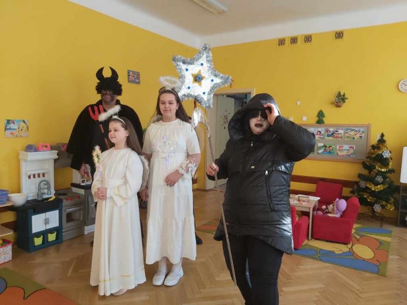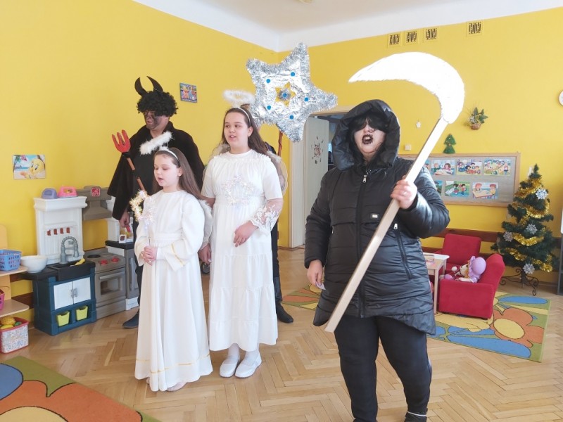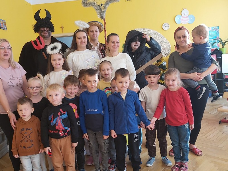 Dzisiaj do naszego przedszkola również zawitała grupa kolędników. Były wśród nich aniołki, gwiazda, diabeł, śmierć oraz chłopak lubelski. Odegrali oni krótką scenkę przeplataną kolędami. Dzieci początkowo nieufnie oglądały występy, jednak po krótkim czasie wszyscy zaczęli śmiało śpiewać kolędy razem z kolędnikami. Chętnie zrobili sobie również pamiątkowe zdjęcie z niespodziewanymi gośćmi.