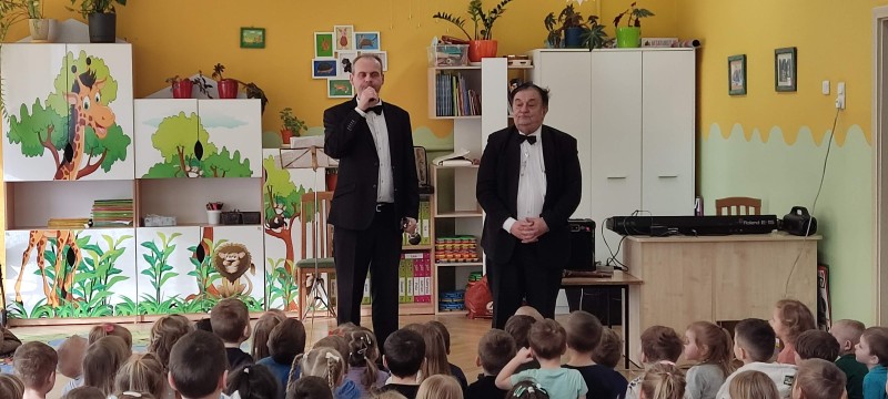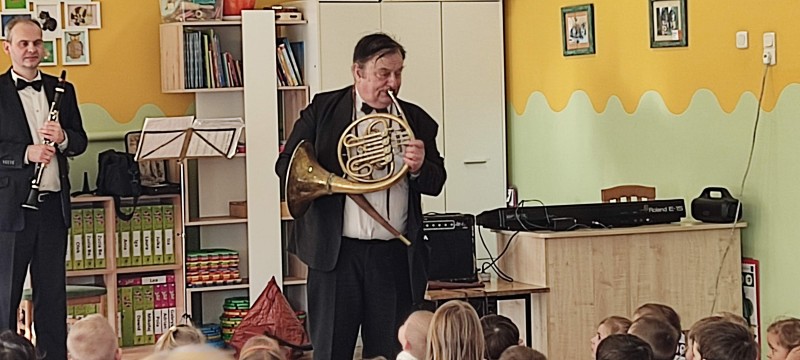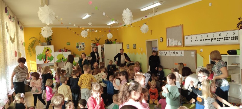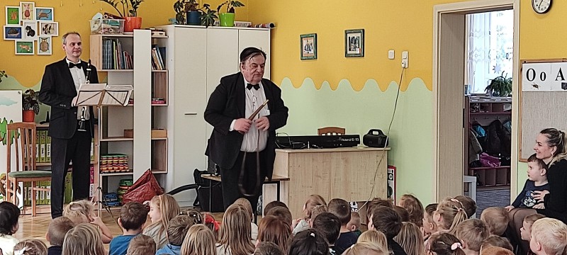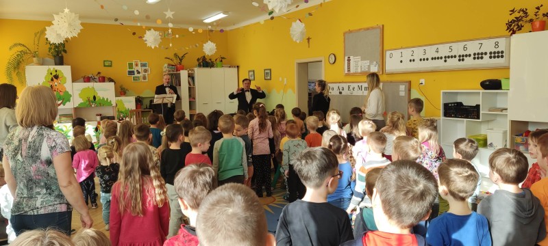 22 stycznia po raz kolejny gościliśmy w naszym przedszkolu profesjonalnych muzyków z Filharmonii z Lublina. Muzycy w koncercie pt. „W świątecznym nastroju” przypomnieli dzieciom wygląd, budowę i brzmienie klarnetu. Zaprezentowali "nowe" instrumenty z rodzaju dętych: róg, flet, waltoria. Zagrali różne melodie z muzyki klasycznej, popularne piosenki zimowe np. "Zima, zima, zima" oraz kolędy. Włączali dzieci do wspólnej zabawy poprzez wystukiwanie rytmu, klaskanie, machanie. Koncert przyniósł dzieciom wiele radości. Z niecierpliwością czekają na kolejny wiosenny koncert.