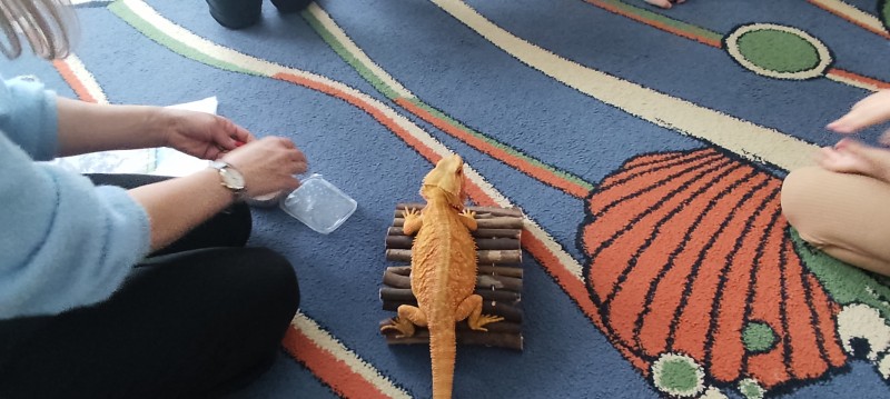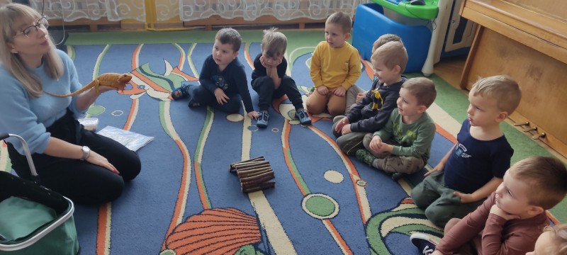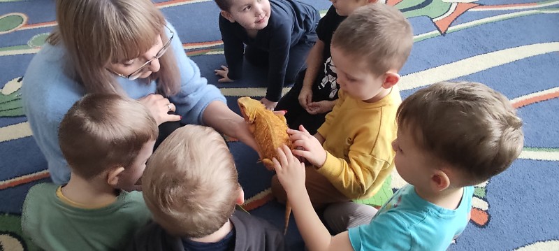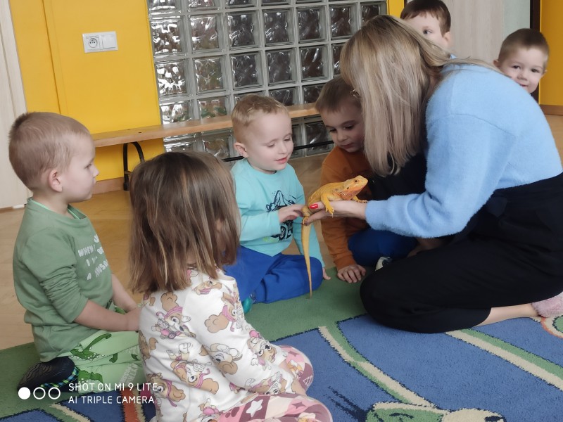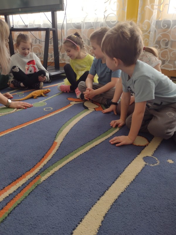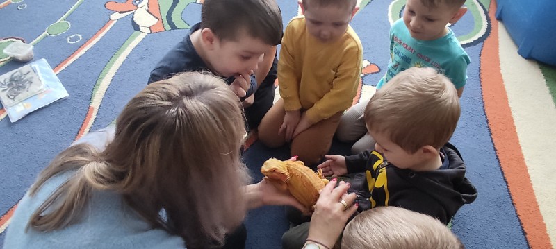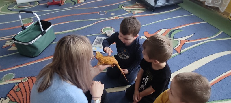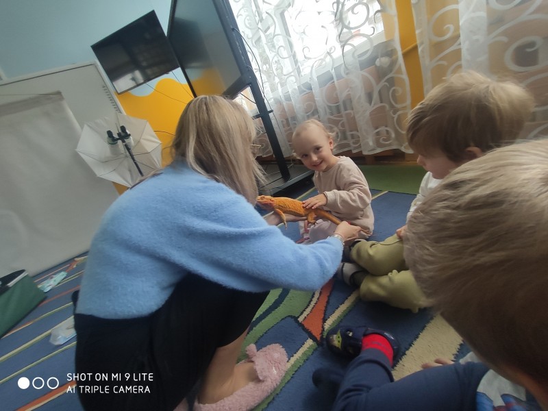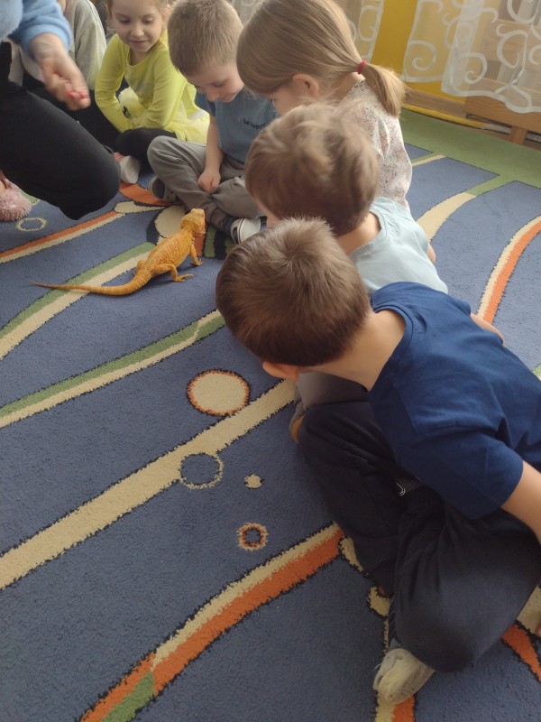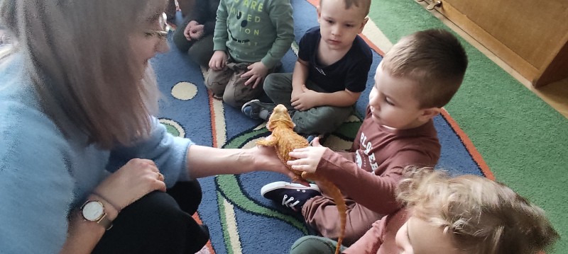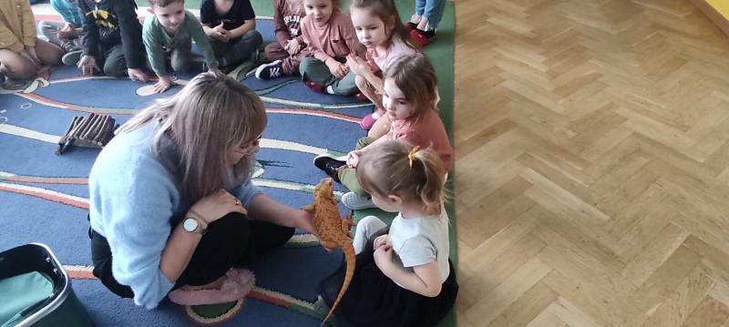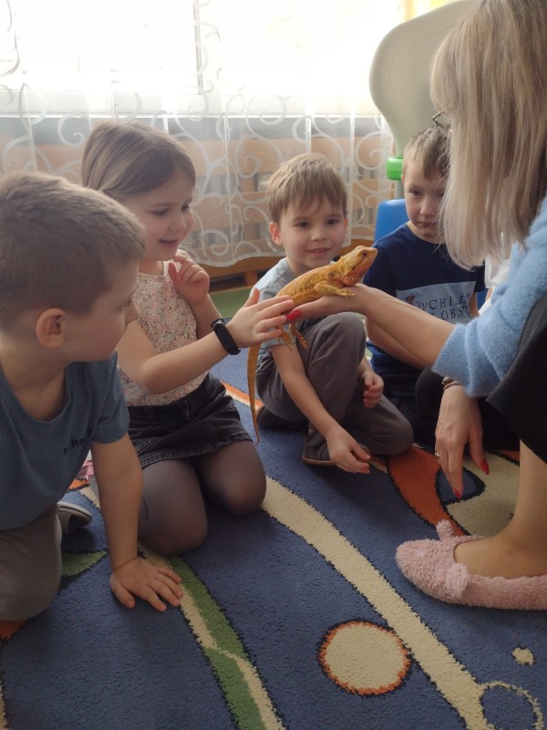 W dniu dzisiejszym nasze przedszkole odwiedzili nietypowi goście - Agama Brodata wraz z opiekunką. Opiekunka jaszczurki opowiedziała dzieciom o zwyczajach jej podopiecznej, trybie życia, a także wiele ciekawostek na temat jaszczurek. Przedszkolaki z ogromnym zaciekawieniem słuchały wykładu. Wszystkie dzieci mogły pogłaskać Agamę i przyjrzeć jej się z bliska. Na koniec oczywiście były pamiątkowe zdjęcia portretowe.