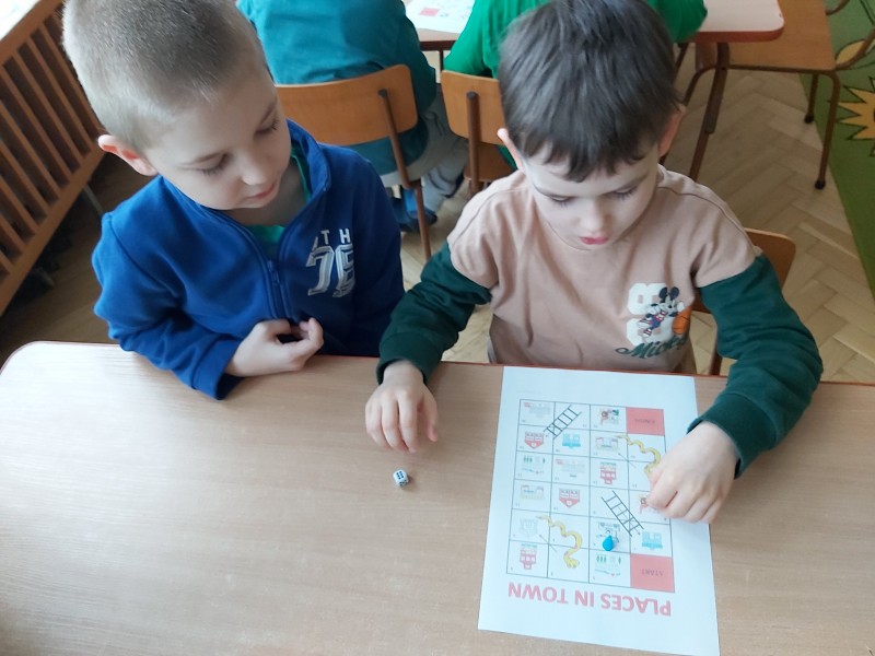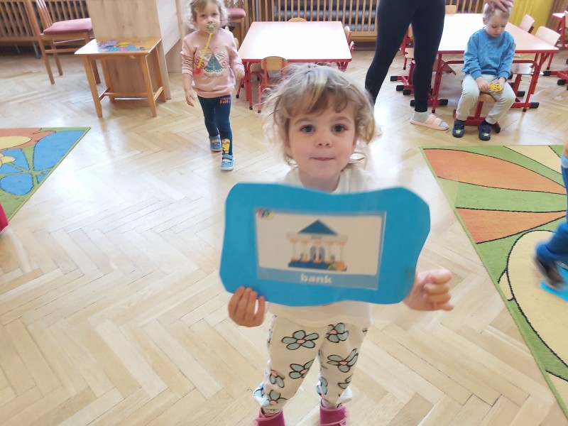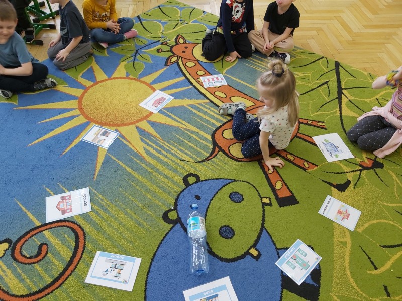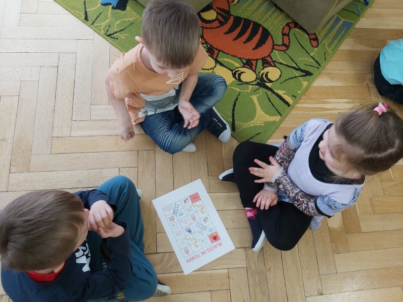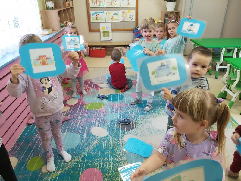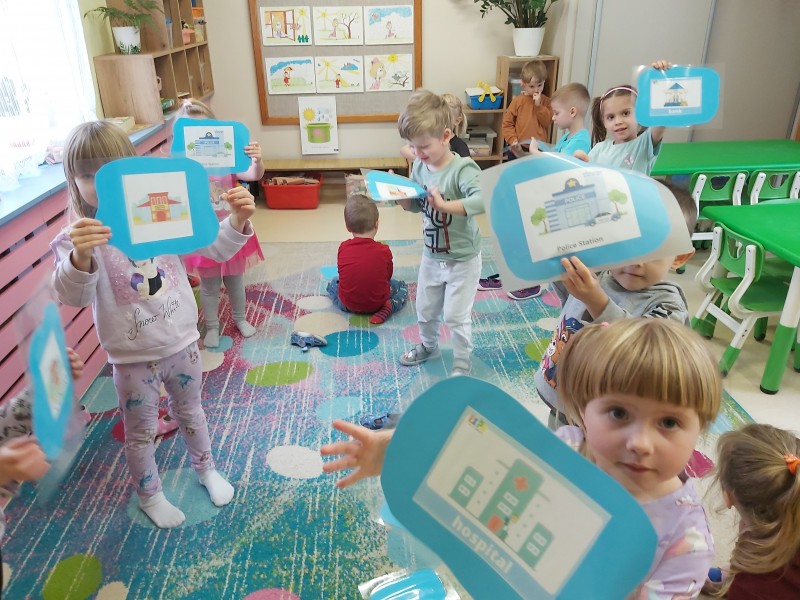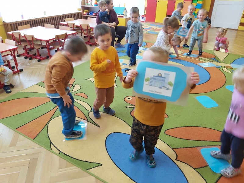 Przez kolejny tydzień marca na zajęciach z języka angielskiego dzieci poznawały nazwy różnych budowli i miejsc znajdujących się w mieście (bank, bus station, police station, fire station, cinema, school, park, restaurant, shop, supermarket). Towarzyszyły nam różnorodne gry i zabawy ruchowe.