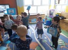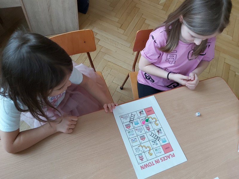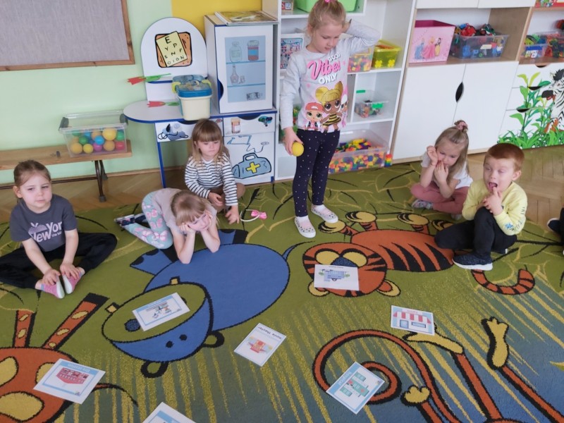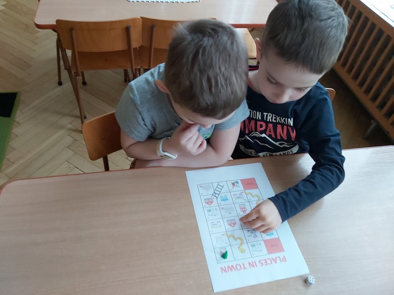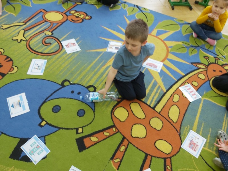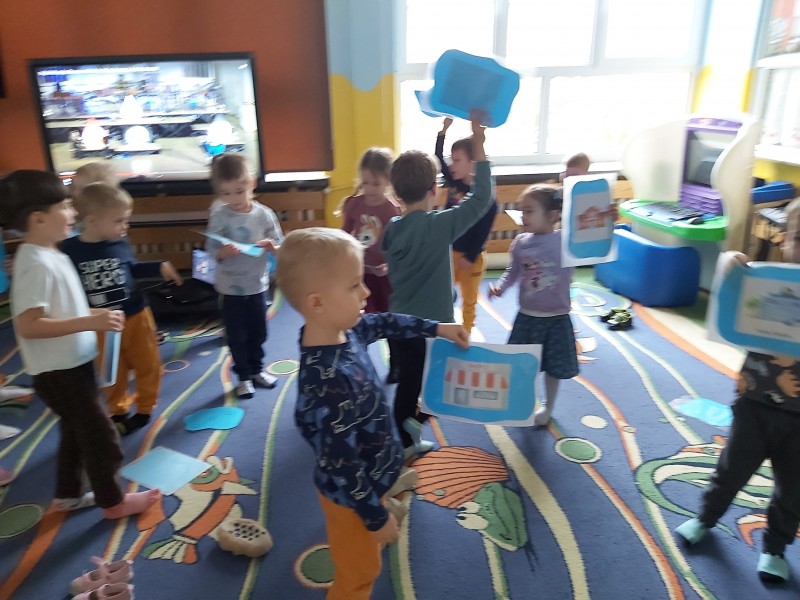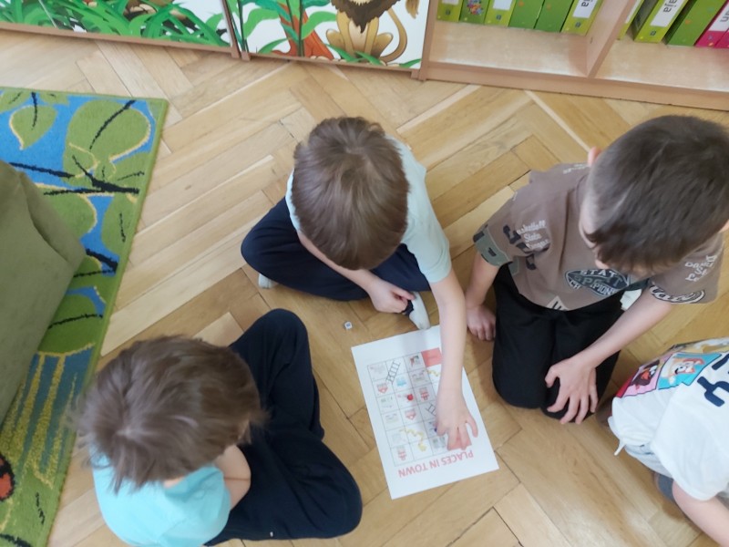 Przez kolejny tydzień marca na zajęciach z języka angielskiego dzieci poznawały nazwy różnych budowli i miejsc znajdujących się w mieście (bank, bus station, police station, fire station, cinema, school, park, restaurant, shop, supermarket). Towarzyszyły nam różnorodne gry i zabawy ruchowe.