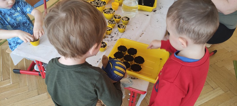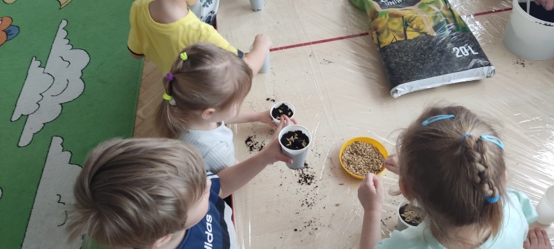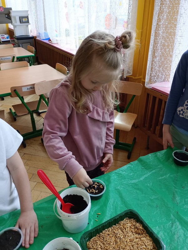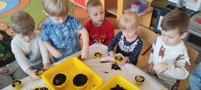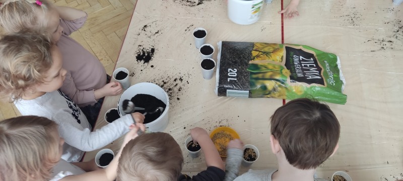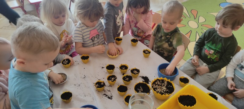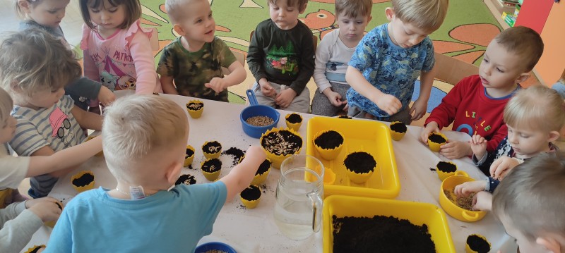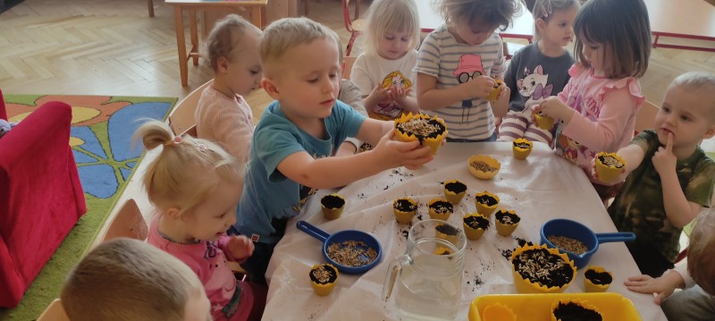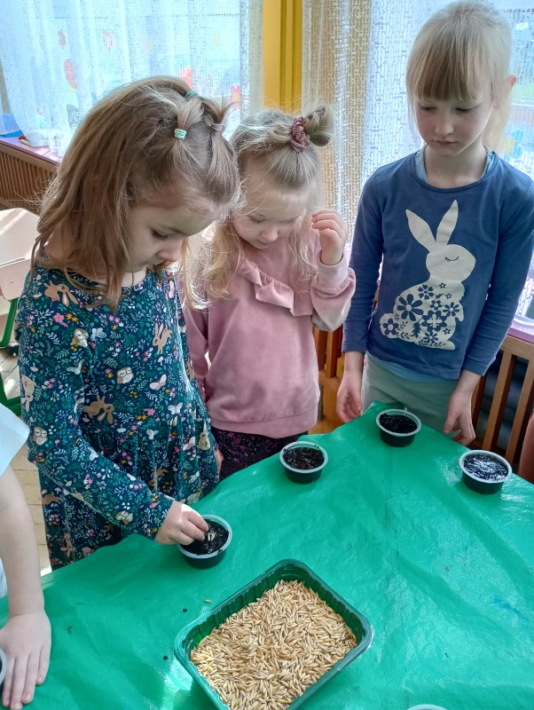 Przedszkolaki z grupy I powoli przygotowują się do Wielkanocy. Dziś do doniczek z ziemią dzieci wysiały owies – symbol zdrowia, szczęścia, a przede wszystkim urodzaju. Każdy otrzymał doniczkę, którą napełnił ziemią, posypał owsem, podlał, a potem ustawił na parapecie. Gdy owies wykiełkuje dzieci zabiorą go do domu, aby przyozdobić nim stół wielkanocny.