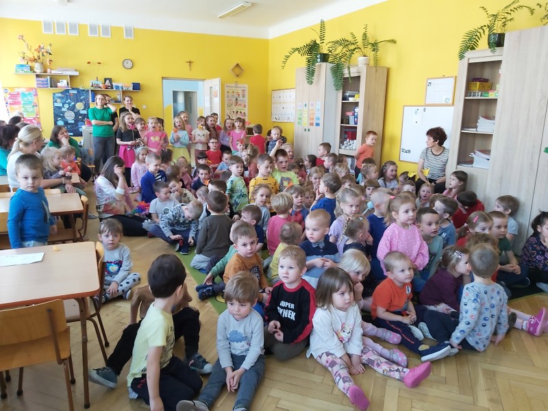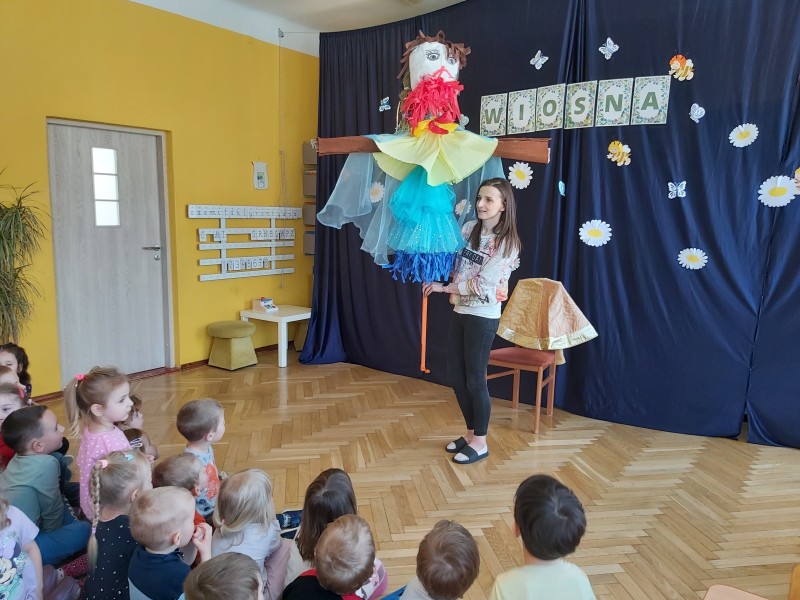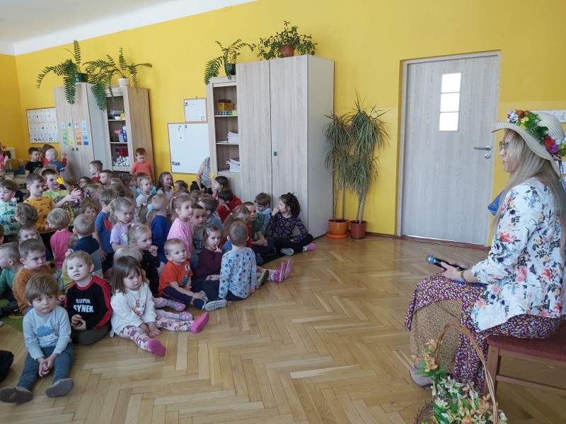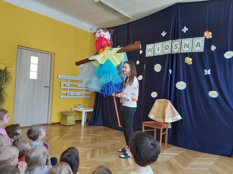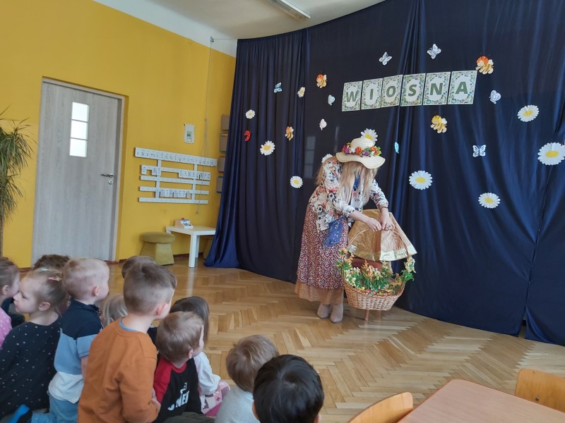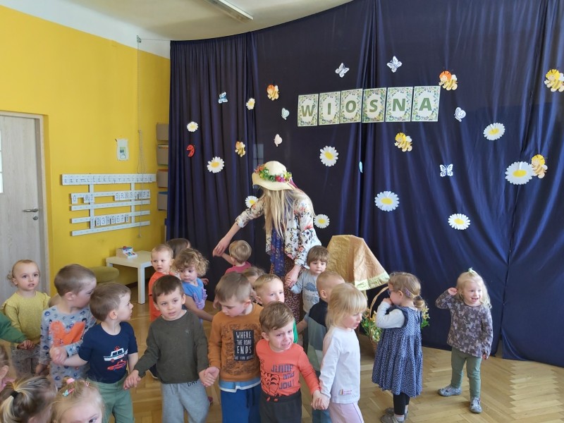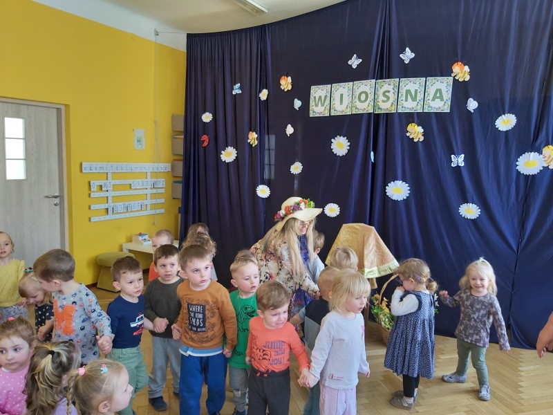 W czwartek 21 marca 2024r. przyszła w końcu Pani Wiosna. Dzieci przy piosence "Uciekaj Zimo" pożegnały zimę - Marzannę, a śpiewając "Maszeruje Wiosna" powitały wiosnę. Po wysłuchaniu wszystkich prezentacji Pani Wiosna rozdała dzieciom drobny słodki upominek.