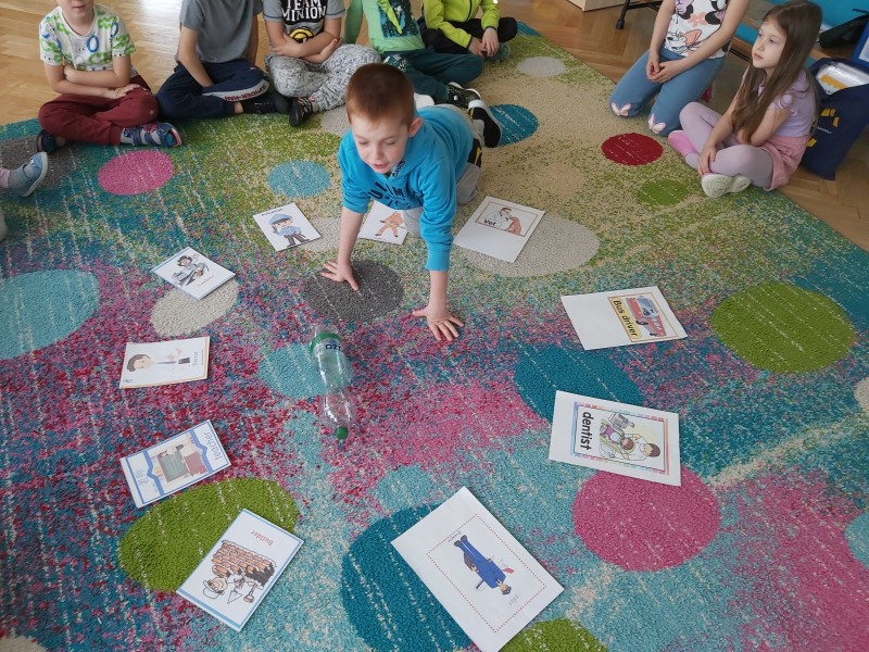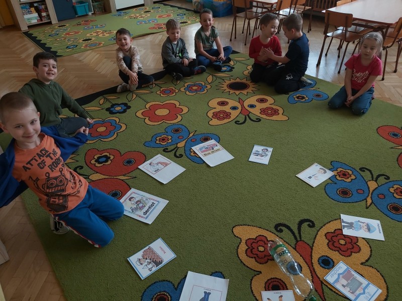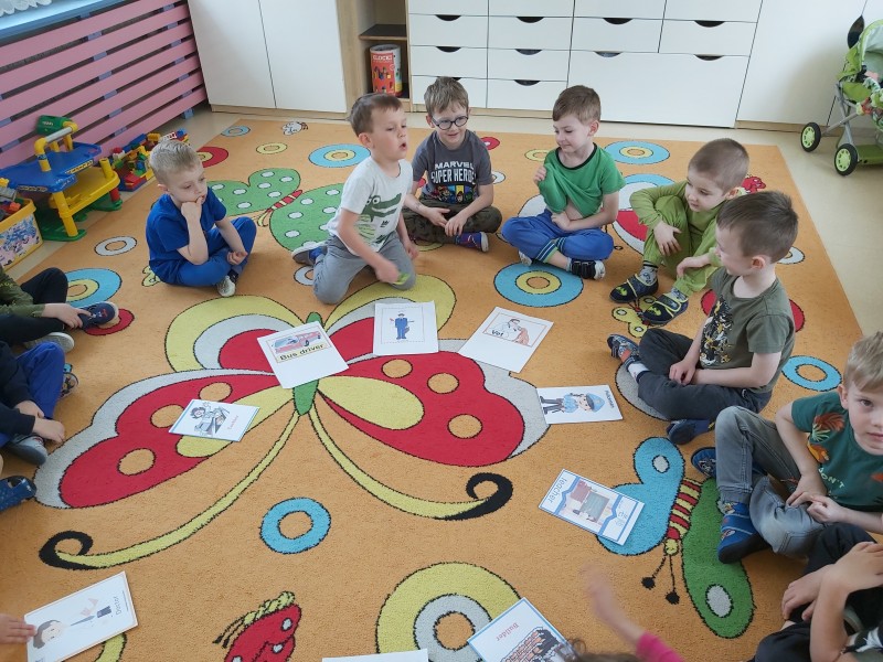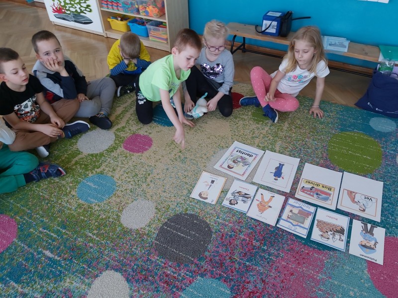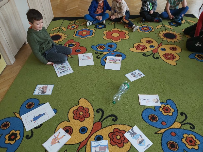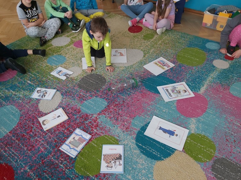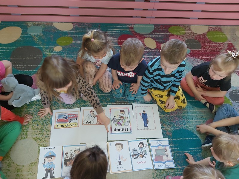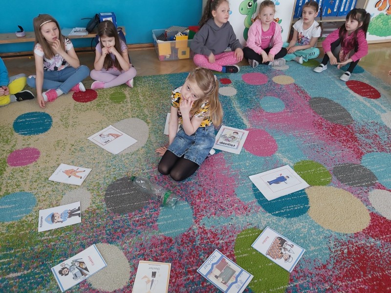Na pierwszych kwietniowych zajęciach z języka angielskiego rozmawialiśmy "What happens in spring" (In Spring nature wakes up, plants grow, the grass is green, flowers bloom, the days are long, Bears wake up from hibernation, ladybugs are all around, bees collect pollen and nectar, birds builds nests, snails come out, birds sings... i wiele innych). W drugim tygodniu kwietnia dzieci poznały nazwy zawodów (jobs, occupations) - a doctor, a builder, a dentist, a driver, a teacher, a policeman, a firefighter, a dancer, a singer, a vet, a pilot. Dzieci próbowały również odpowiedzieć na pytanie What do you want to be in the future?