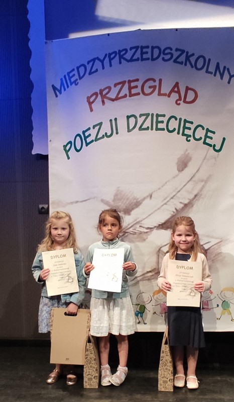 Dzisiaj tj. 10 czerwca w Biłgorajskim Centrum Kultury odbył się Międzyprzedszkolny Przegląd Poezji Dziecięcej zorganizowany przez Samorządowe Przedszkole nr 2 w Biłgoraju. Tematem tegorocznego przeglądu było "Dobro, tolerancja i pomoc innym w wierszu". Wśród 23 uczestników przeglądu byli również reprezentanci naszego Przedszkola. Pięknie przygotowane wiersze powiedziały: Julia z gr. VI, Alicja z gr. II oraz Łucja z gr. V. Dziewczynki zaprezentowały się doskonale choć nie obyło się bez tremy. W nagrodę otrzymały dyplomy oraz drobne upominki.