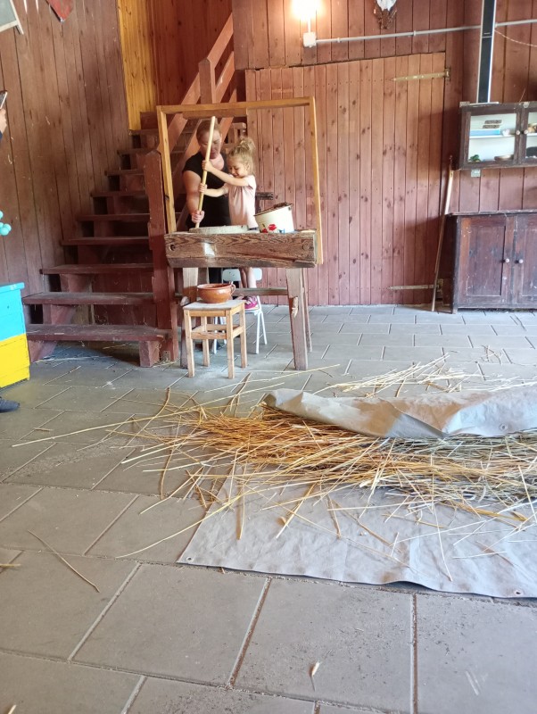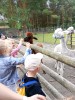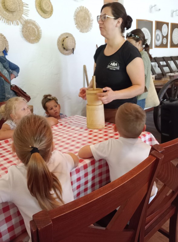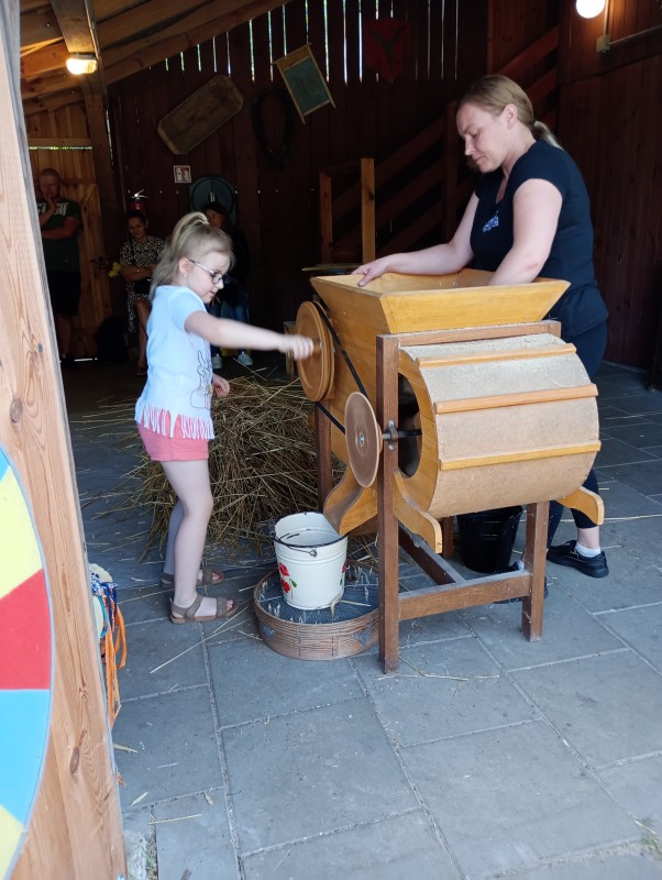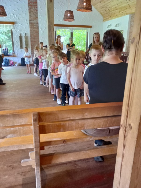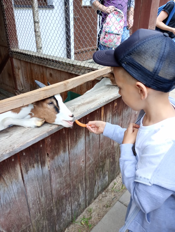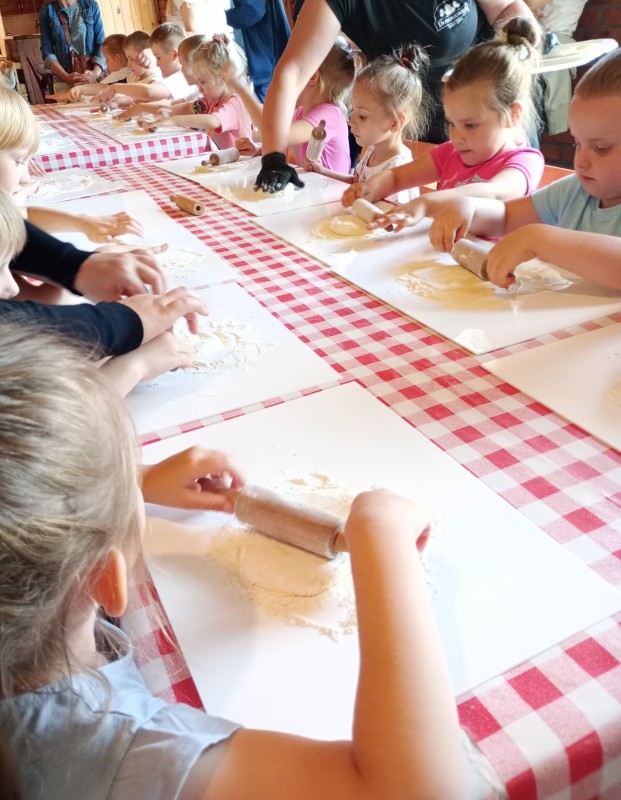 Dnia 17.06.2024 r. grupa II wybrała się razem z rodzicami na wycieczkę do Osady Leśnej „Doboszówka” w Kalenne. Celem tego wyjazdu było: przybliżenie życia naszych przodków, zapoznanie z podstawowymi zbożami i ich zastosowaniem, prezentacja maszyn dawniej wykorzystywanych przy uprawie i obróbce ziarna, omawianie procesu powstawania masła oraz udział w warsztatach „Od ziarenka do bochenka”. Warsztaty te dały dzieciom możliwość mielenia ziarna na mąkę w żarnach, pokaz wyrabiania chleba, formowanie bochenków oraz własnoręczny wypiek. Ważnym elementem wycieczki było zwiedzanie mini ZOO, karmienie zwierząt takich jak: alpaki, króliki, kozy i owce. Dzieci miały również możliwość zabawy na placu zabaw. Ostatnim punktem programu było przedstawienie z okazji Dnia Mamy i Taty. Uczestnicy wycieczki pełni wrażeń i uśmiechu powrócili do swoich domów.