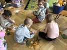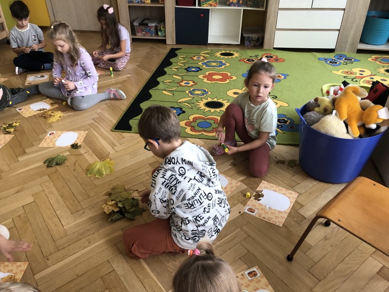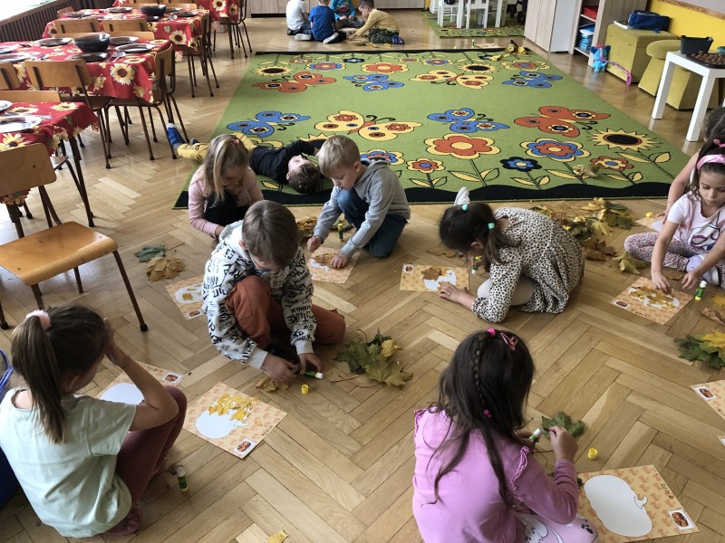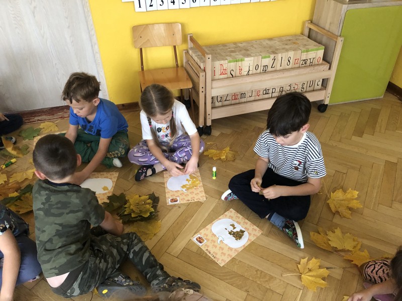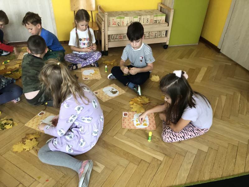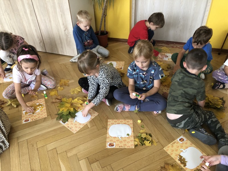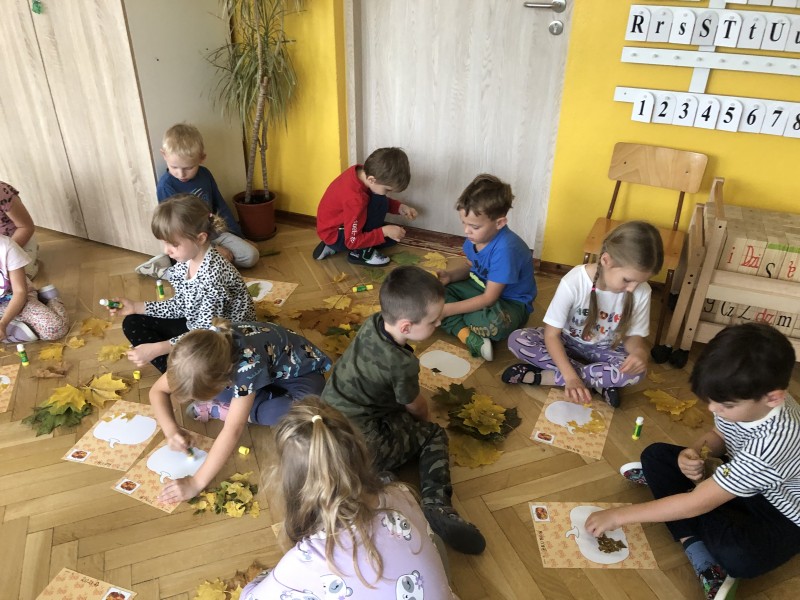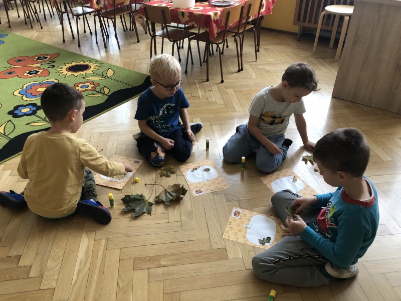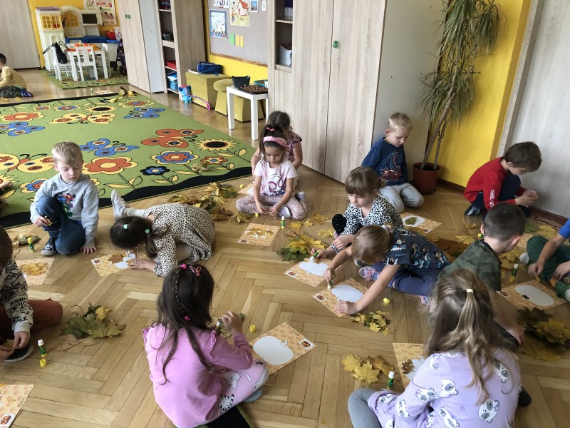 Zajęcia plastyczne pełnią ważną rolę w rozwoju dzieci, opierają się na różnorodnych czynnościach: obserwowaniu, przekształcaniu, interpretowaniu, zbieraniu, formowaniu, rysowaniu, malowaniu, wycinaniu, lepieniu, wydzieraniu, konstruowaniu. Dzieci poznają sposoby posługiwania się określonymi materiałami i narzędziami, tak aby uzyskać jak najlepsze efekty pracy. Swoje doświadczenia plastyczne wzbogacają np. poprzez malowanie pędzlem, malowanie gąbkami, malowanie dłońmi i palcami. U wszystkich dzieci zajęcia plastyczne rozwijają wyobraźnię, pobudzają fantazję, uczą cierpliwości i samodzielności. Tym razem dzieci wylepiają z materiału przyrodniczego tj. liści.