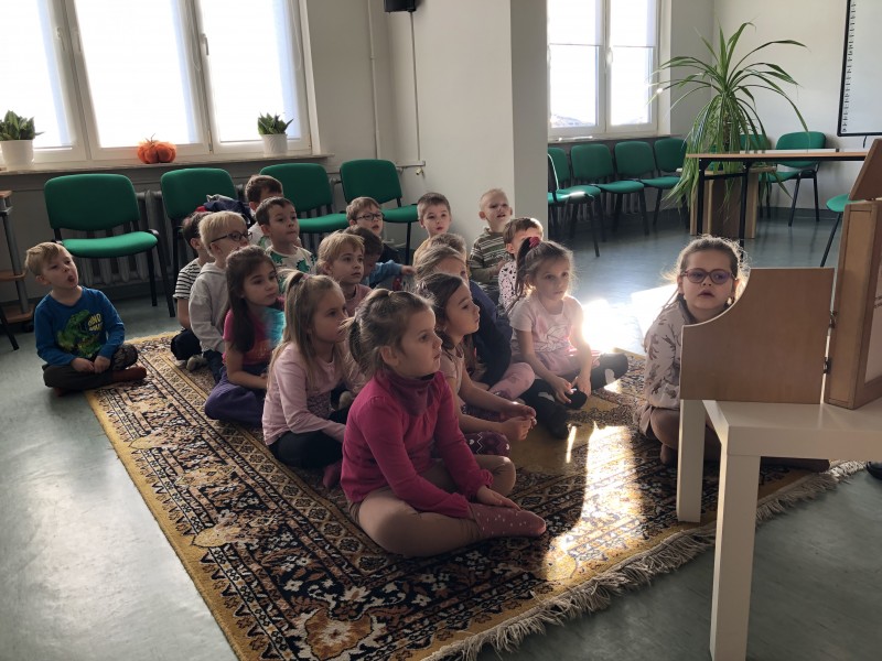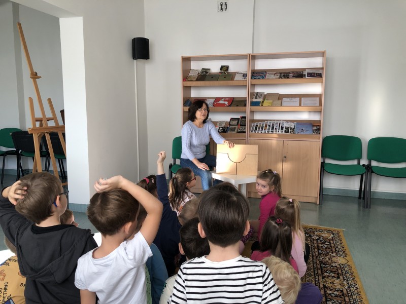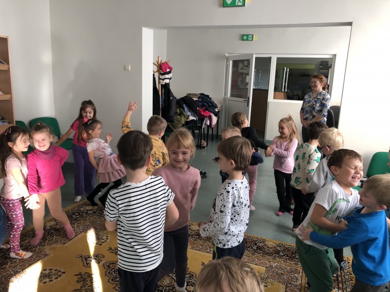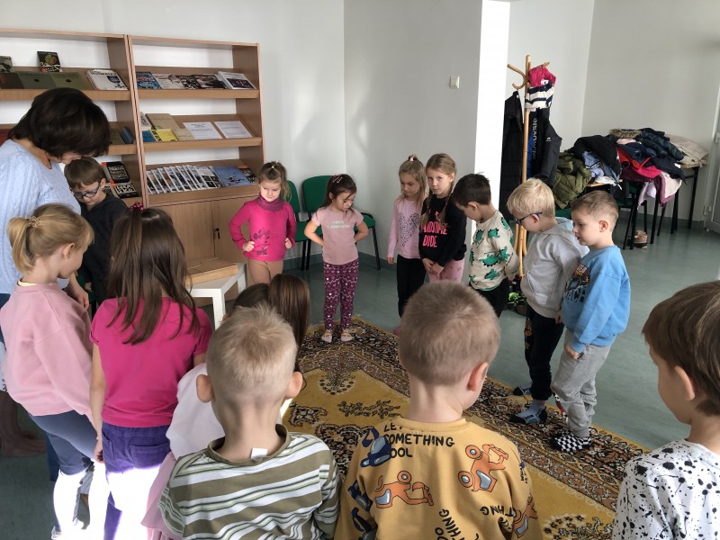 26 listopada 2024 r. przedszkolaki z gr. V kolejny raz odwiedziły bibliotekę. Dzieci z dużym zainteresowaniem wysłuchały czytanego przez Panią Bibliotekarkę opowiadania ,,Kura i złote jajko” w formie teatrzyku kamishibai oraz uczestniczyły w zabawach ruchowych na podstawie specjalnych rymowanek. Dzieci doskonale wiedziały, co to jest biblioteka i jak należy się w niej zachowywać. Dowiedziały się również co może dać większe szczęście w życiu - ,,złoto czy miłość i szacunek?” Dziękujemy za miłe spotkanie!