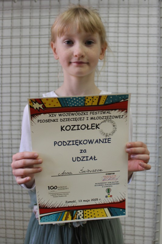 13 maja w Młodzieżowym Dom Kultury im. Kornela Makuszyńskiego w Zamościu odbył się XIV Wojewódzki Festiwal Piosenki Dziecięcej i Młodzieżowej „Koziołek” - Zamość 2025 r. Nasze przedszkole reprezentowała Ania Ś. z grupy Kotki. Jesteśmy z Niej ogromnie dumni. Jej występ był pełen uroku, radości i dziecięcej energii. To dla nas wielka radość i zaszczyt, że mogliśmy mieć swoją reprezentantkę na tak prestiżowym wydarzeniu muzycznym. Gratulujemy i życzymy dalszych sukcesów!