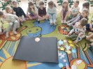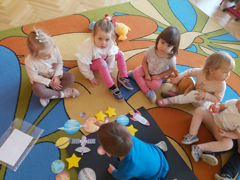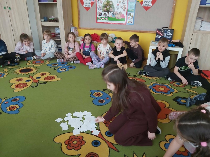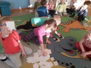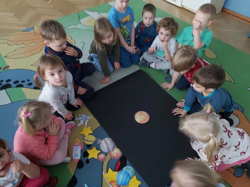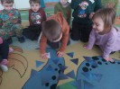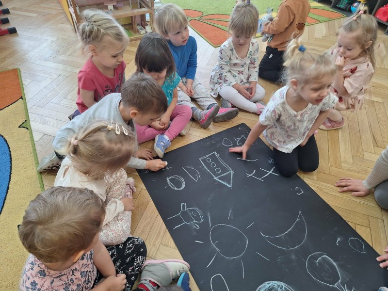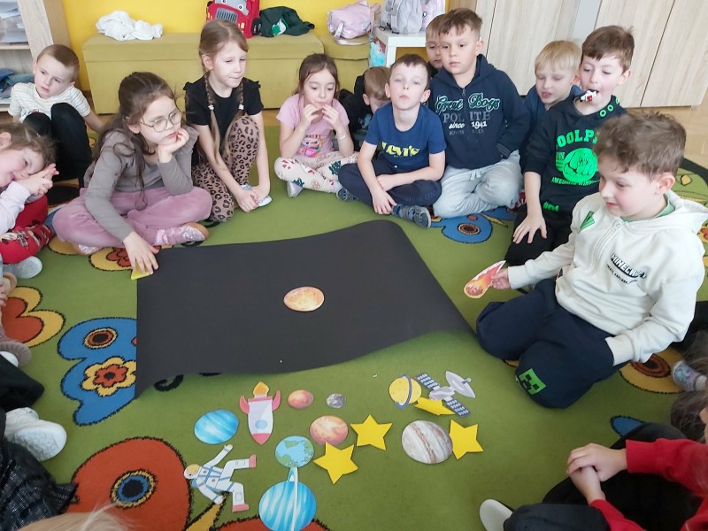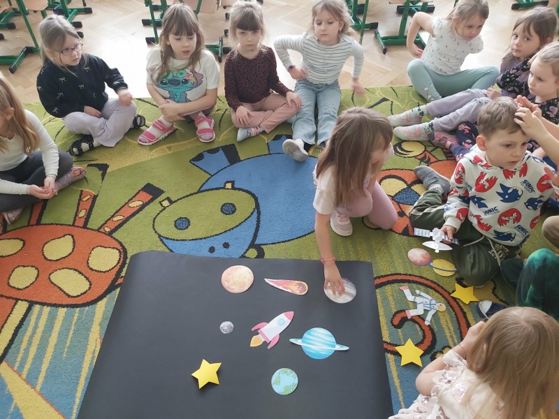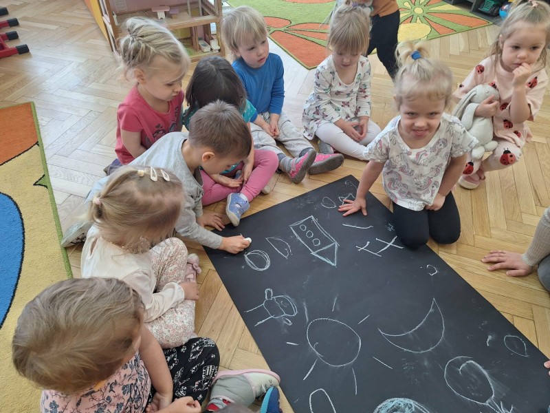 W styczniu dzieci poznawały słownictwo związane z kosmosem (star, earth, solar system, cosmonaut, rocket, comet). Projektowaliśmy przestrzeń kosmiczną. Przypominaliśmy również słownictwo związane z rodziną. Posługując się kodem tworzyliśmy postać Babci i Dziadka, gdzie ćwiczyliśmy przeliczanie po angielsku oraz części ciała (hair, eyes, ears, moustache, mouth). Bawiliśmy się w zabawy ruchowe o tematyce zimowej.