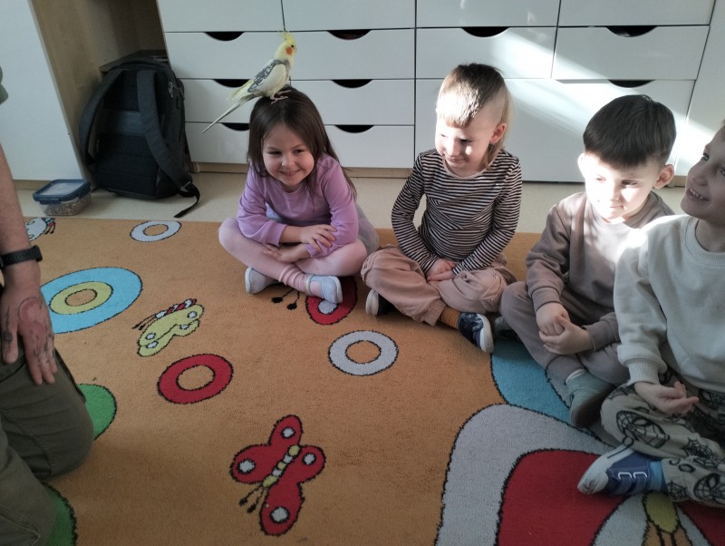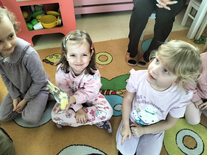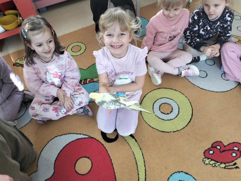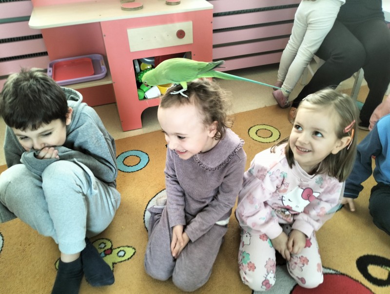 Najwięcej radości sprawił dzieciom bezpośredni kontakt z papugami. Mogły z bliska przyjrzeć się ich barwnym piórom, a nawet potrzymać niektóre z nich na rękach. Choć zdarzało się, że któraś papuga próbowała uciec, delikatnie szczypała dziobkiem lub skubała palce, dla przedszkolaków były to najbardziej emocjonujące i niezapomniane chwile.