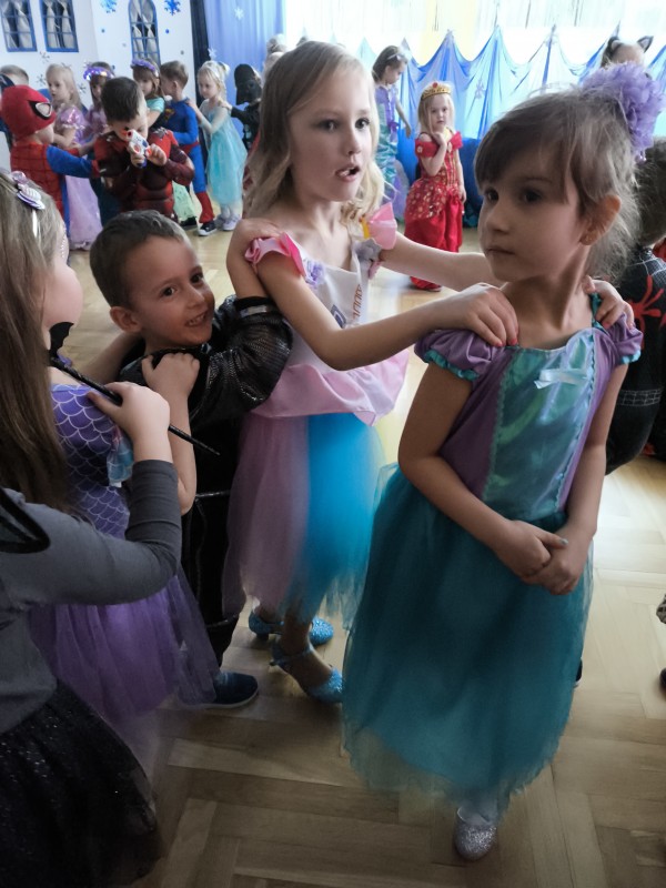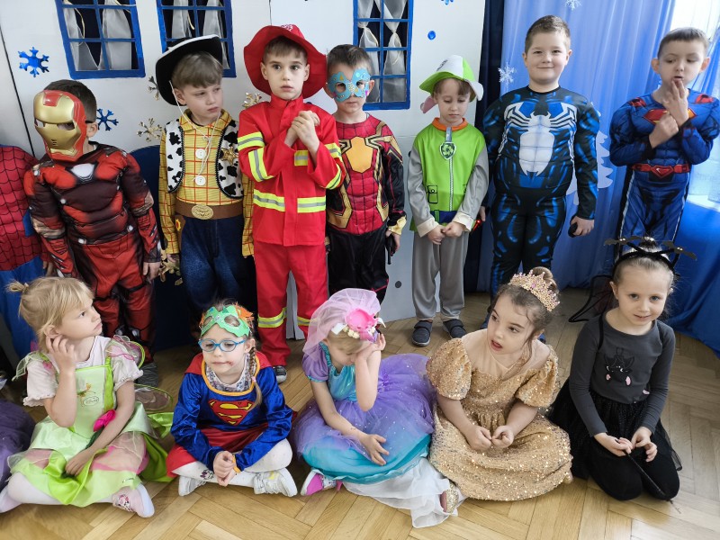 Po intensywnej zabawie przedszkolaki odpoczywały przy wspólnym poczęstunku. Na stołach gościły słodkie przekąski, owoce oraz napoje, które dodały energii do dalszej zabawy. Na zakończenie każdy mógł sobie zrobić pamiątkowe zdjęcie w swoim przebraniu. W ten sposób, karnawałowy bal stał się z pewnością niezapomnianym wydarzeniem, które na długo pozostanie w pamięci zarówno dzieci, jak i ich opiekunów.